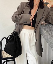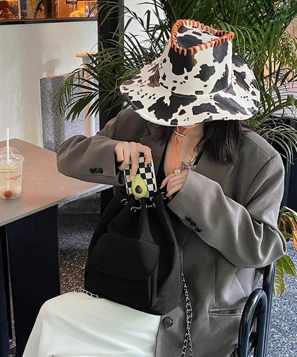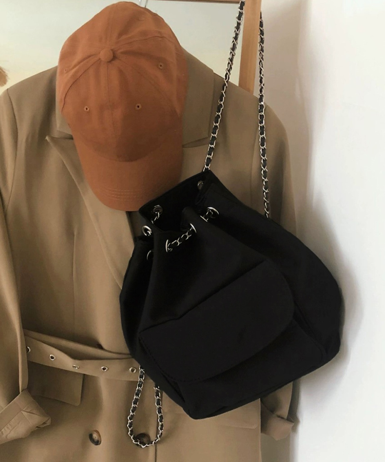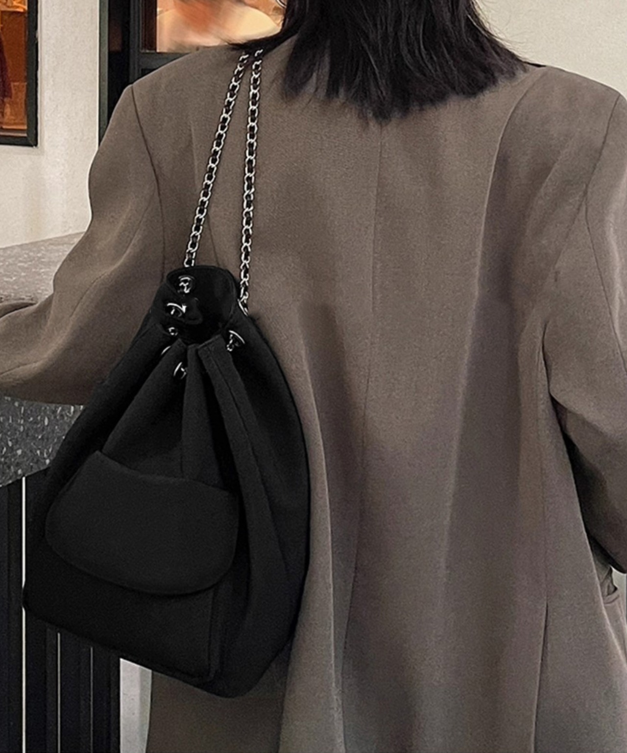 チェーンストラップがアクセントになったシックなドローストリング仕様の3WAYバッグ。