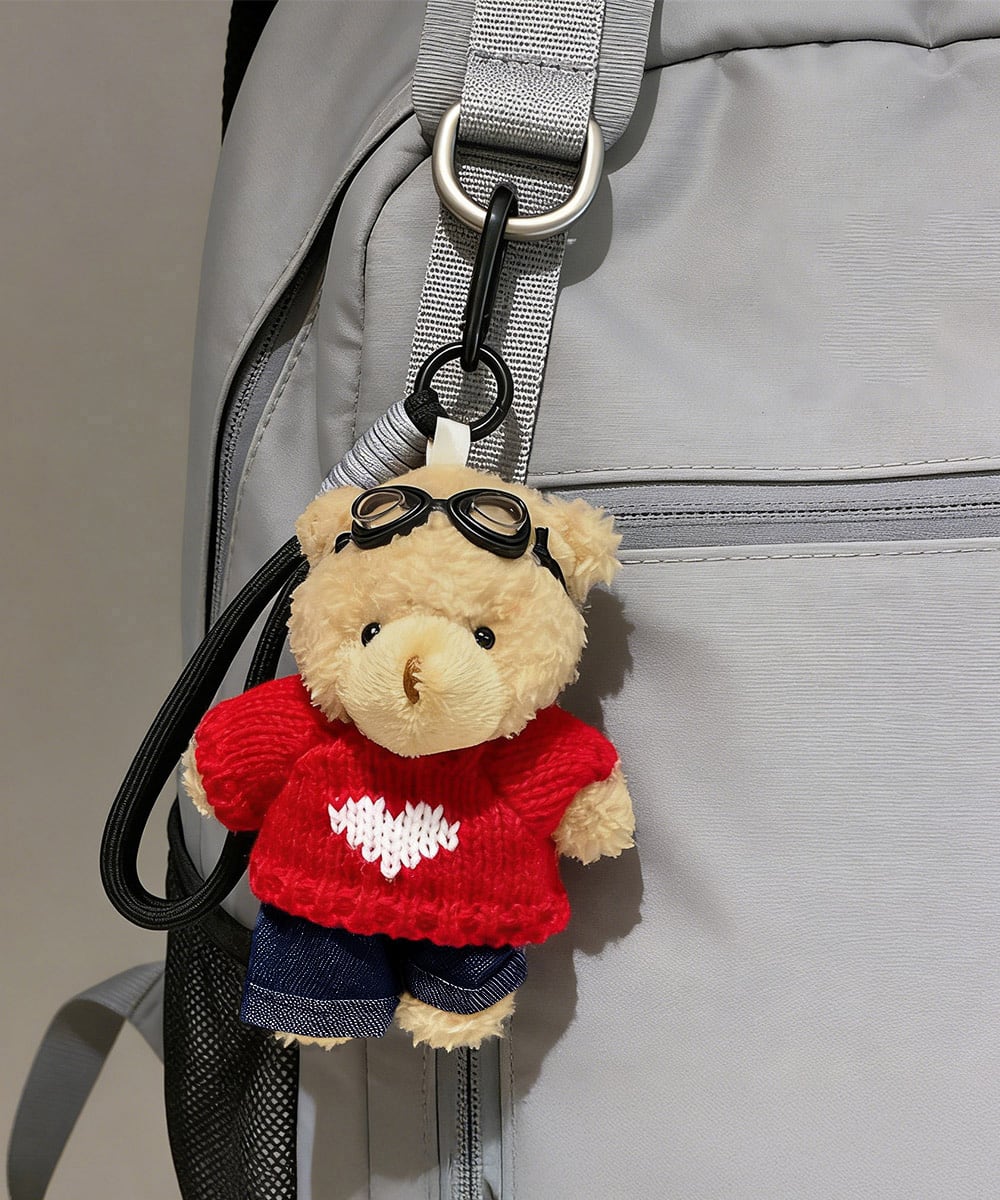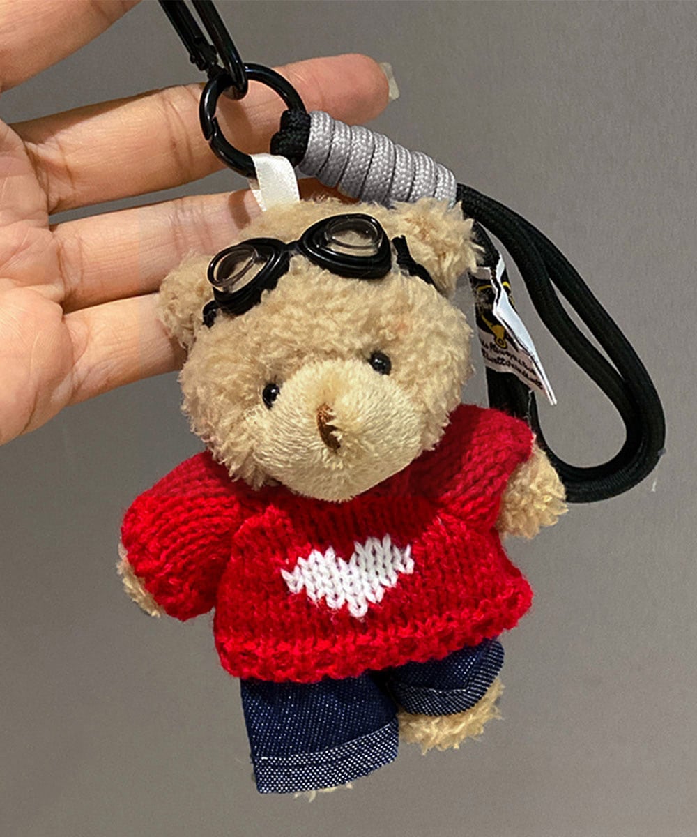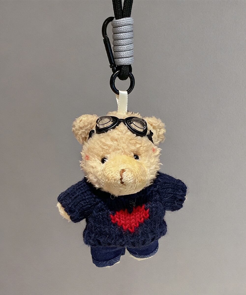 ハートモチーフのニットセーターとヴィンテージライクなゴーグルをかけ、スタイリッシュなデニムパンツを着用したくまさんのぬいぐるみチャーム。