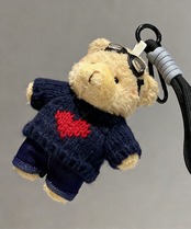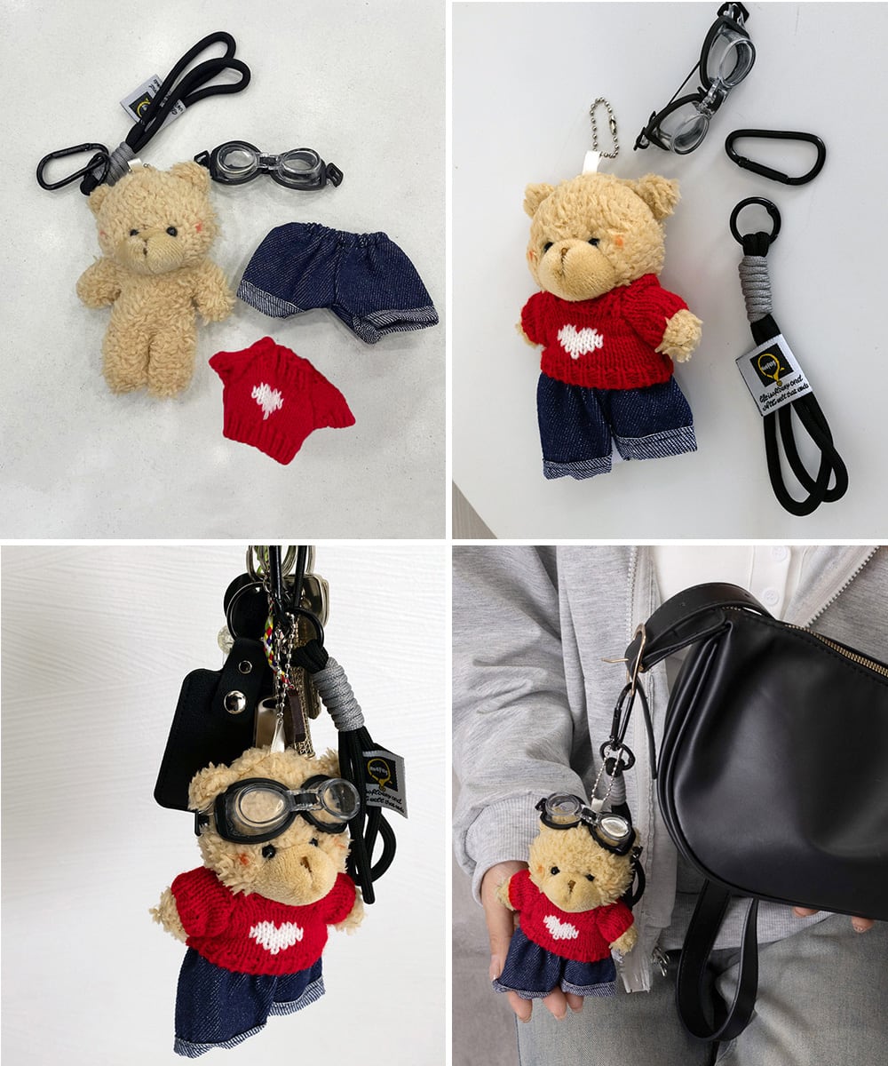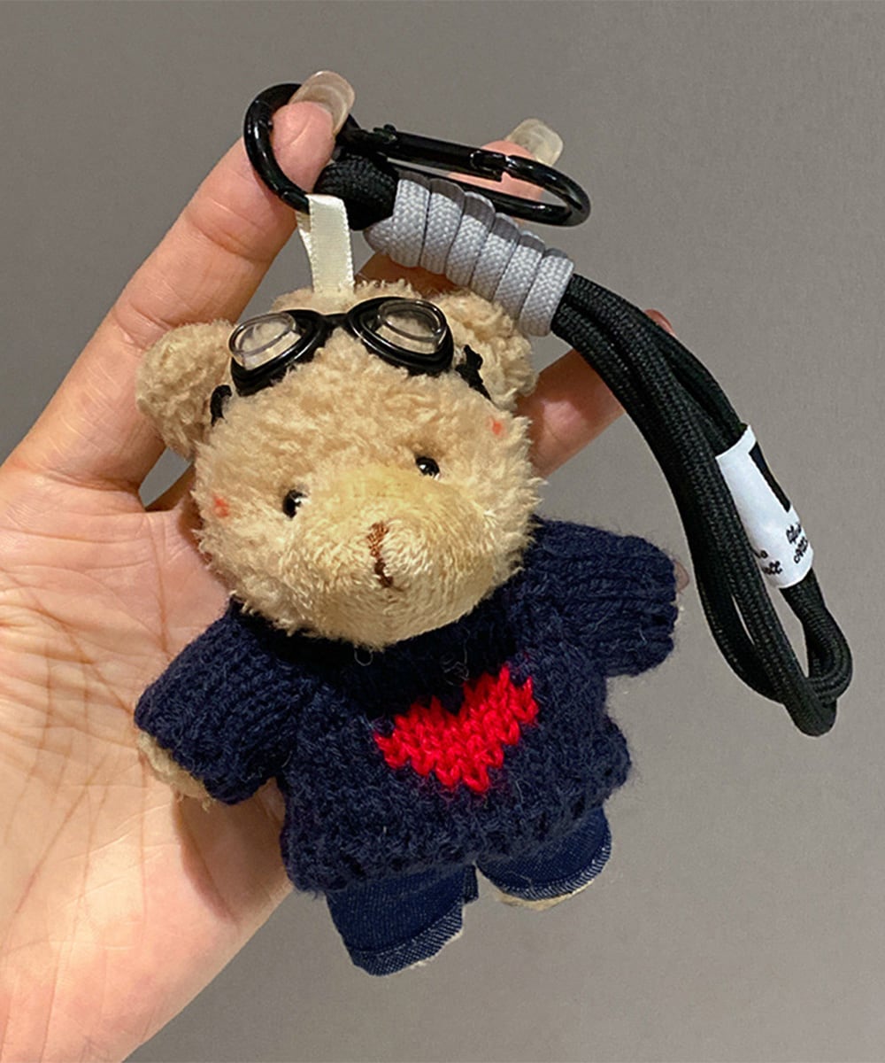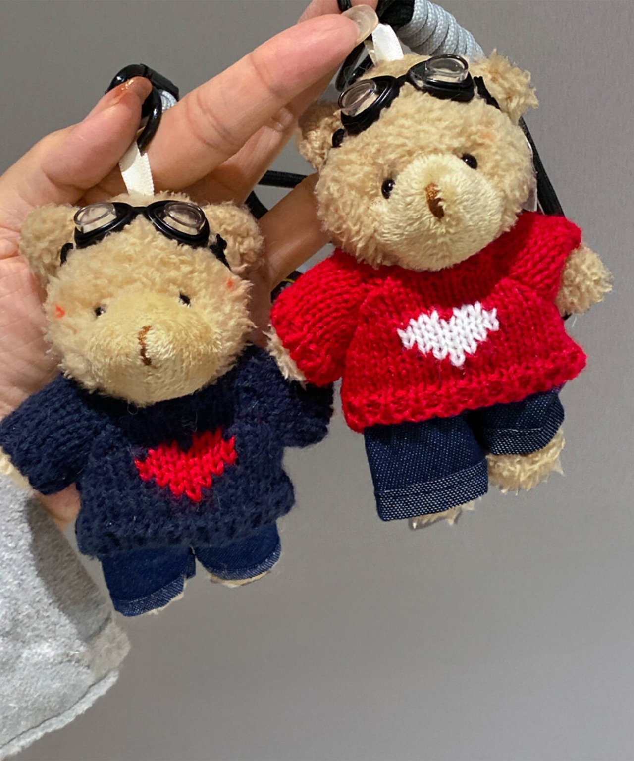 ハートモチーフのニットセーターとヴィンテージライクなゴーグルをかけ、スタイリッシュなデニムパンツを着用したくまさんのぬいぐるみチャーム。