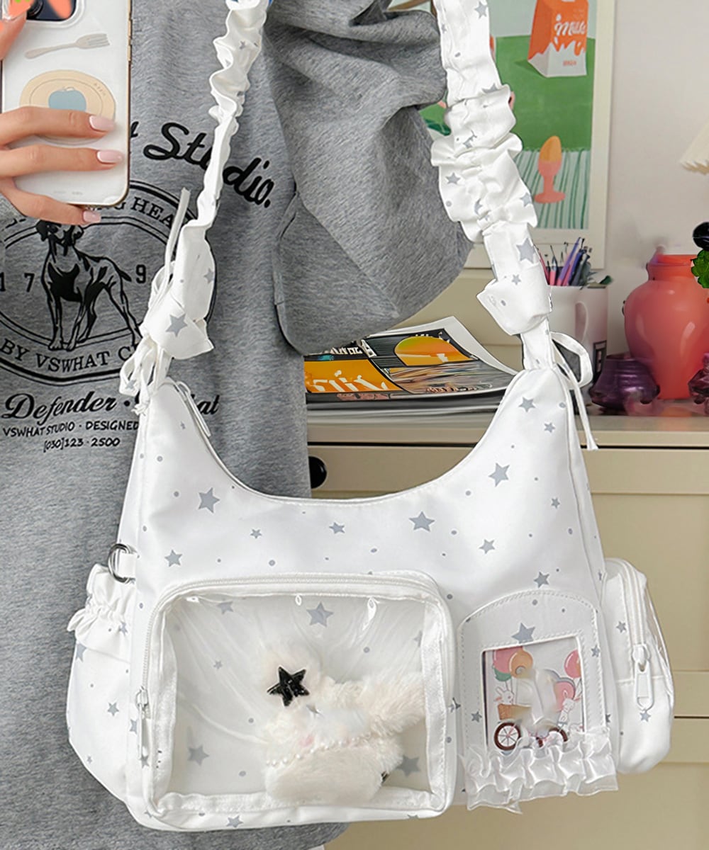 フリルを施したギャザーハンドルが目を引く、可愛い星柄ショルダーバッグ。