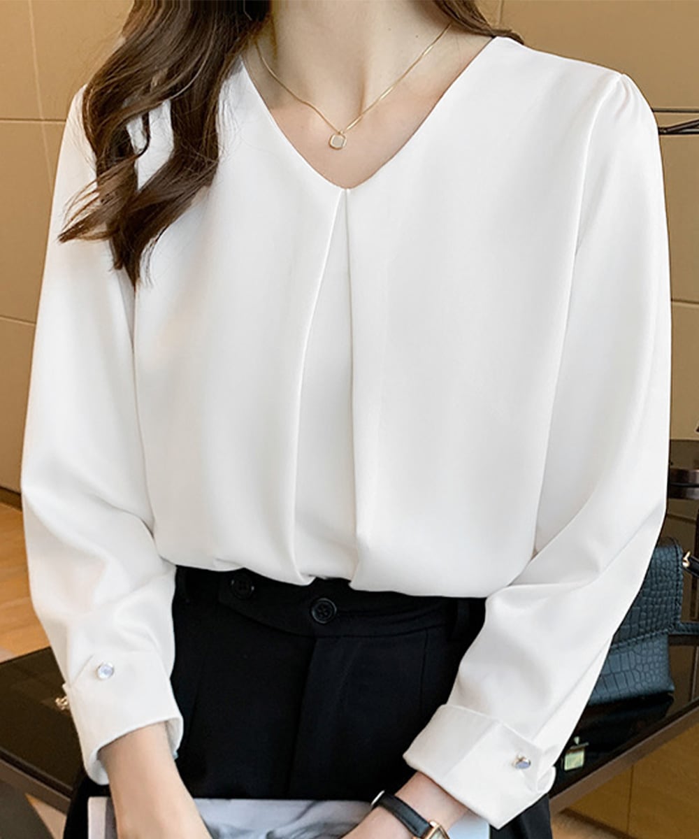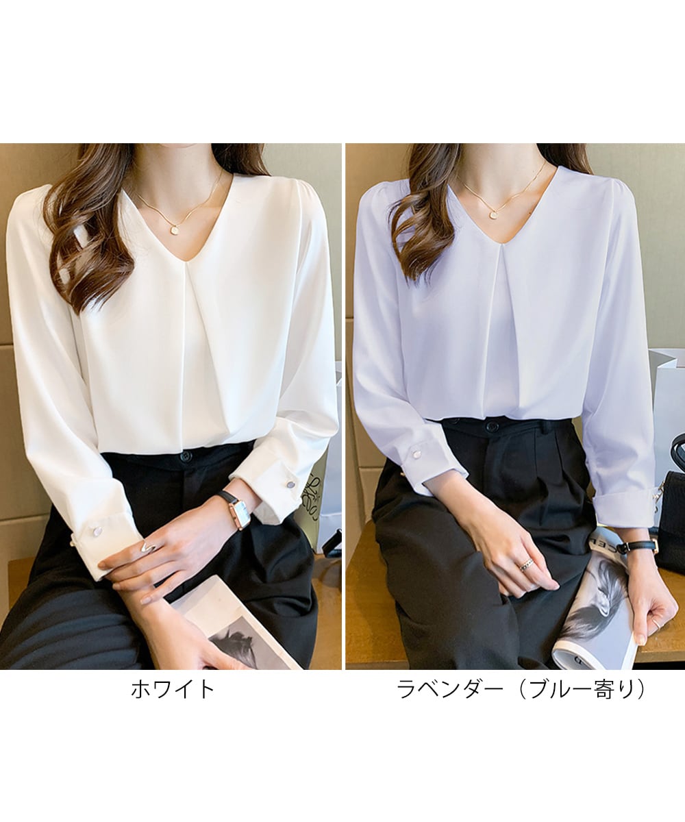 きれいめVネックの長袖シフォンブラウス。