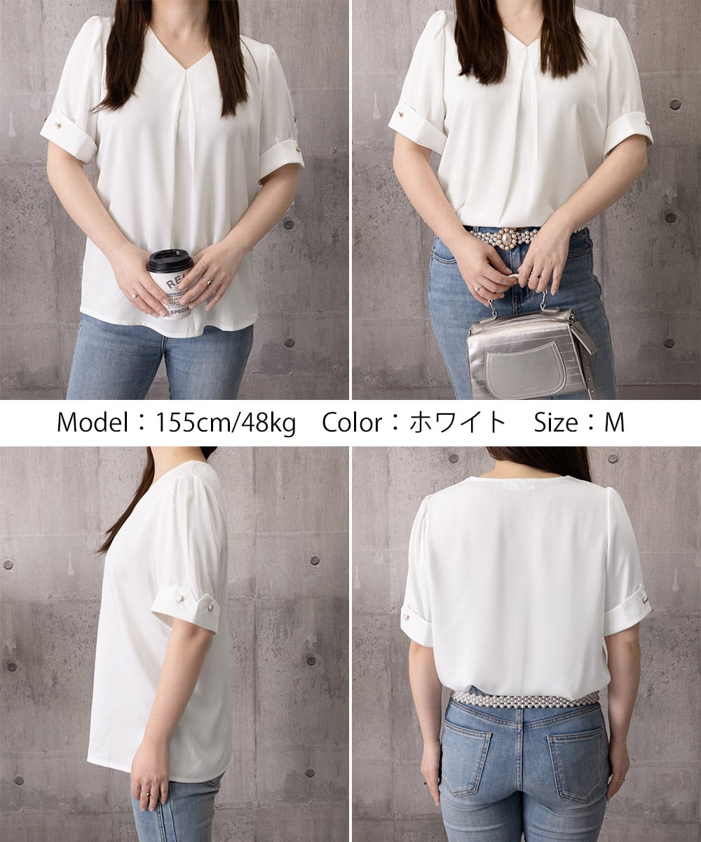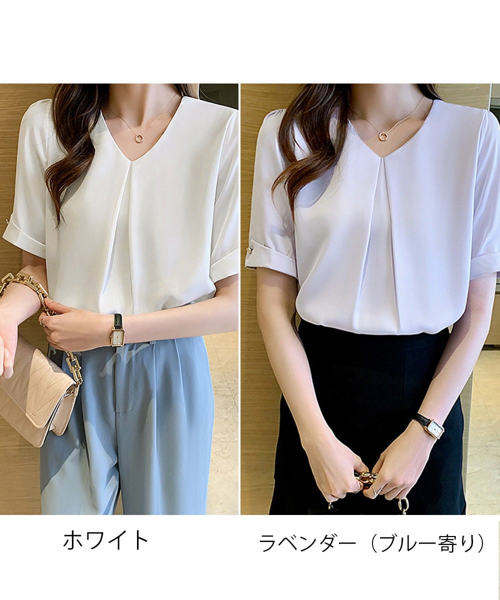 とろみのあるサテン風素材が上品な、デコルテを美しく見せるVネックブラウス。