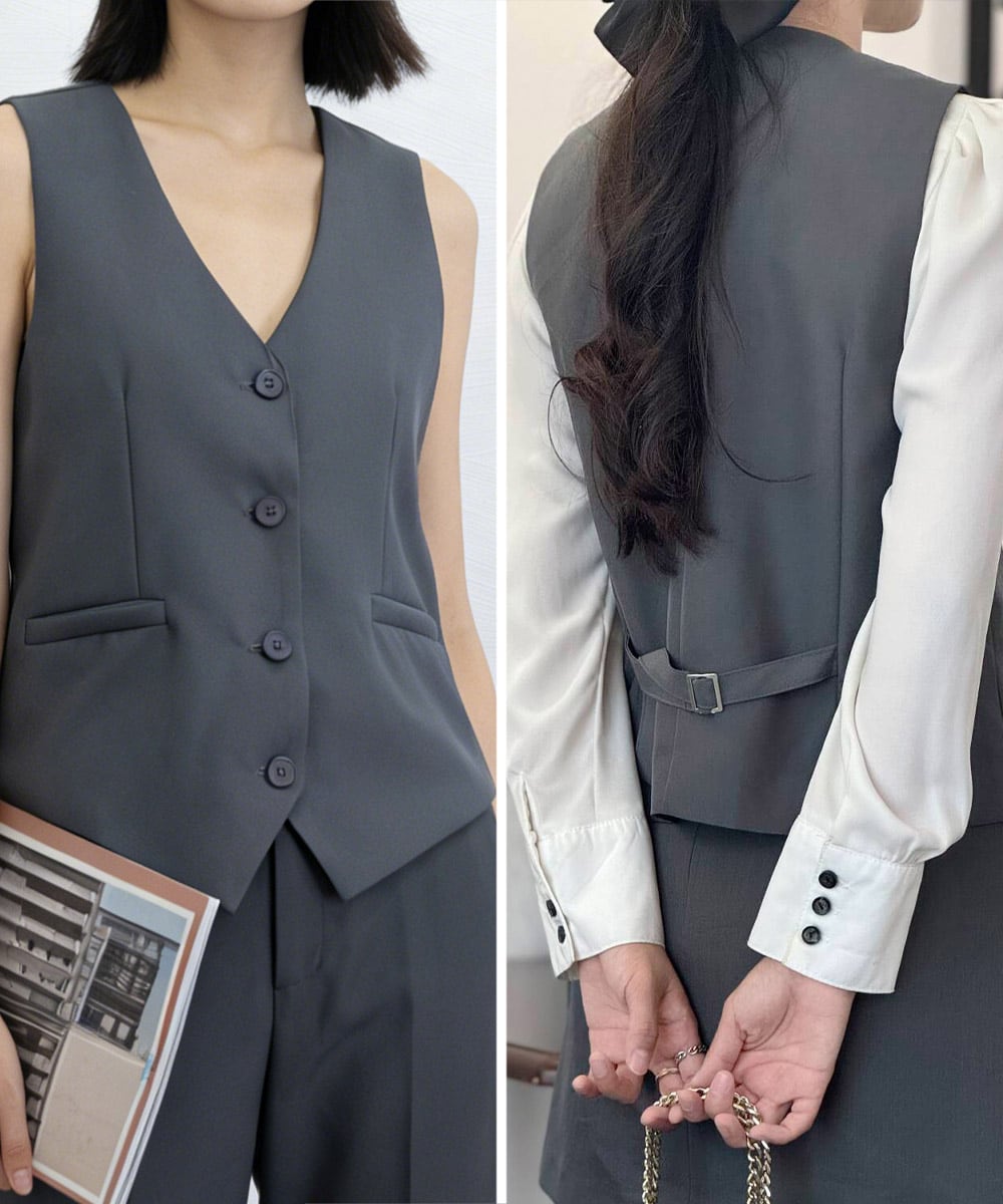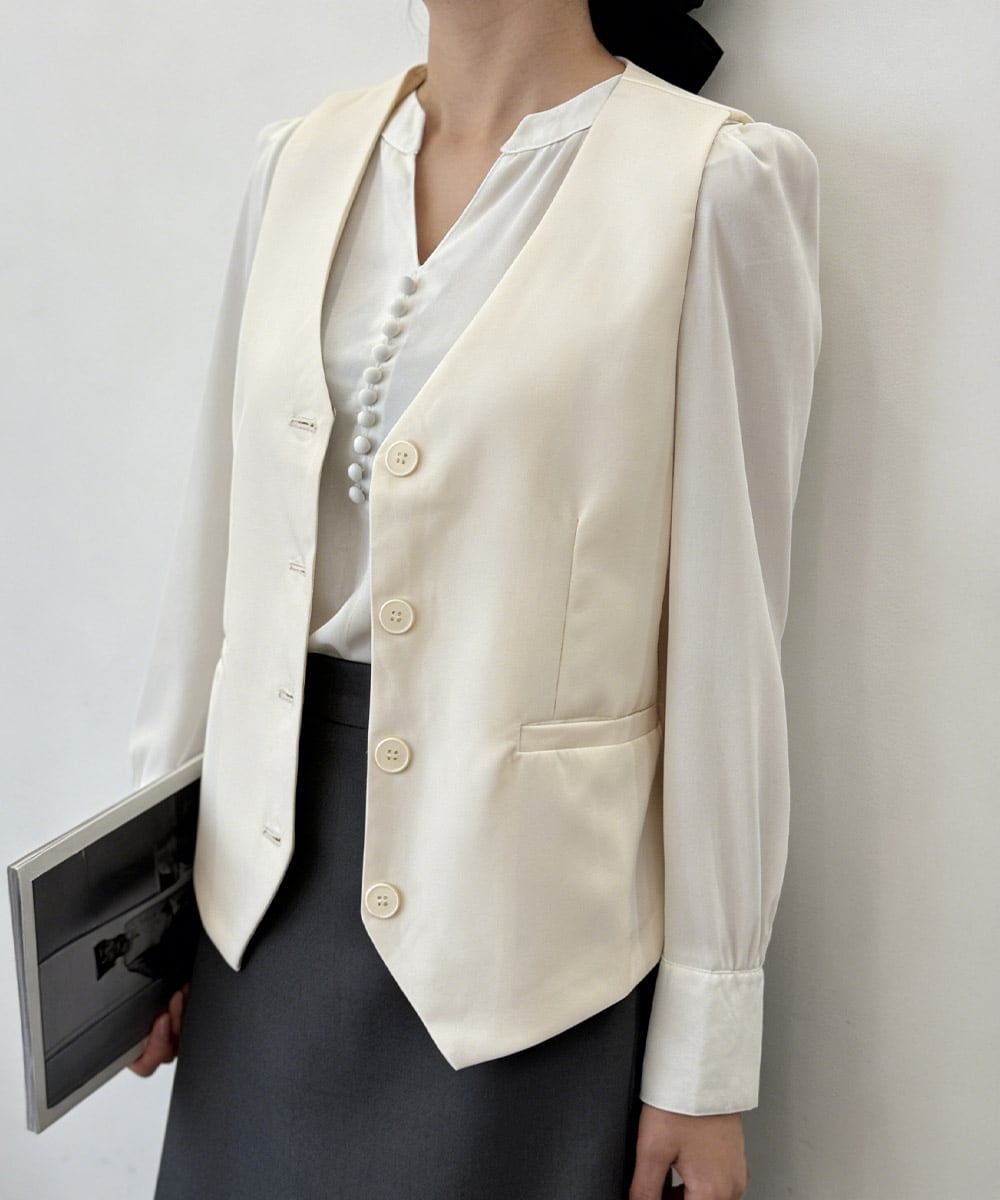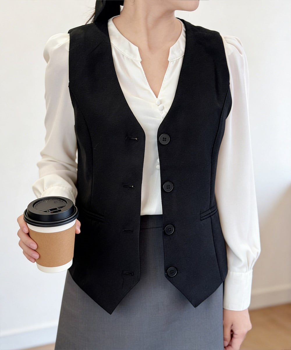 シャープなシルエットが魅力のテーラードデザインベスト。