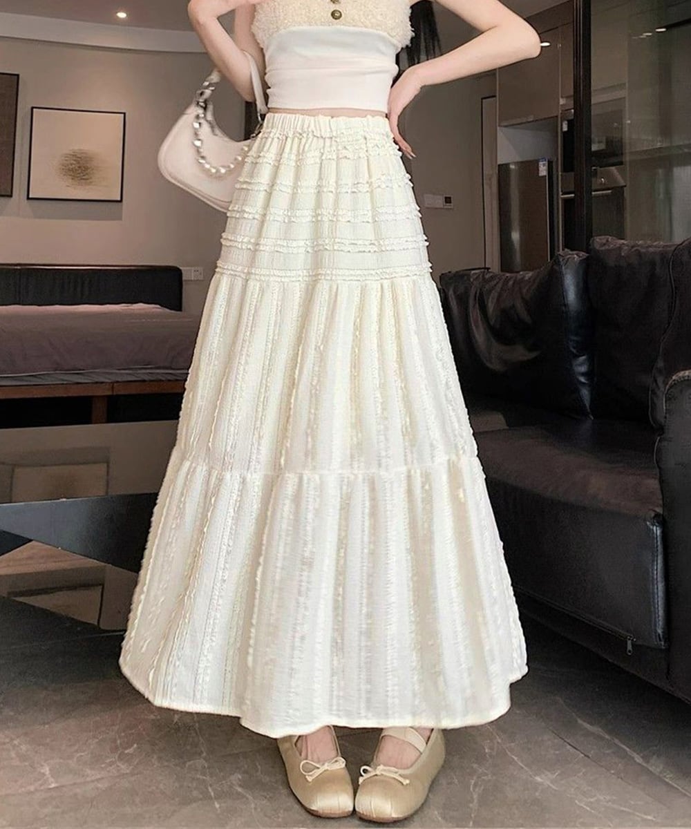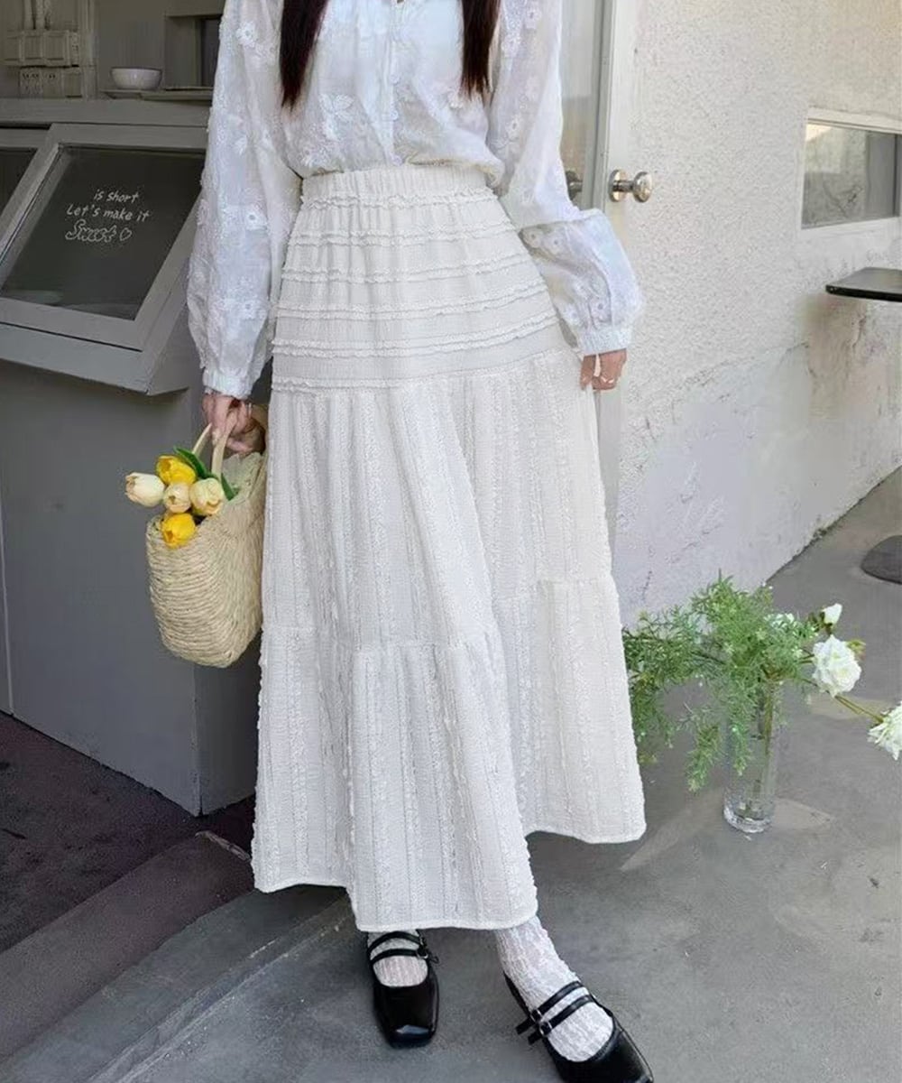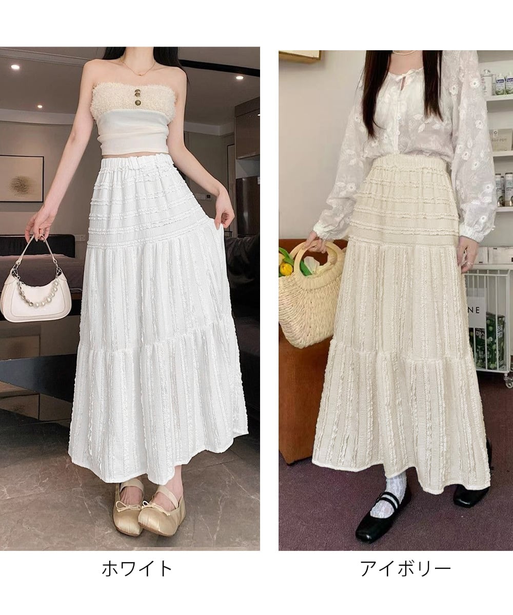 フリルとレースのティアードが重なるロング丈スカート。
