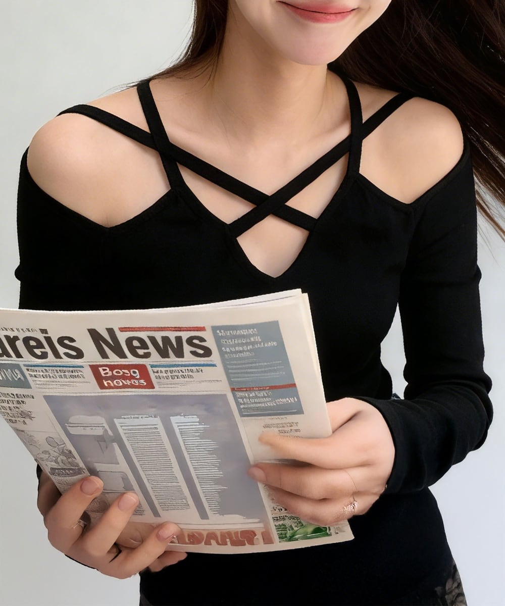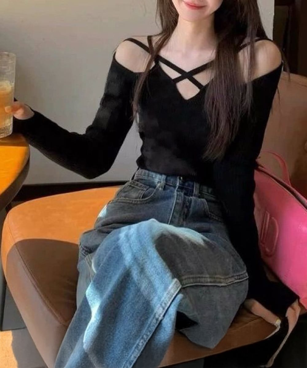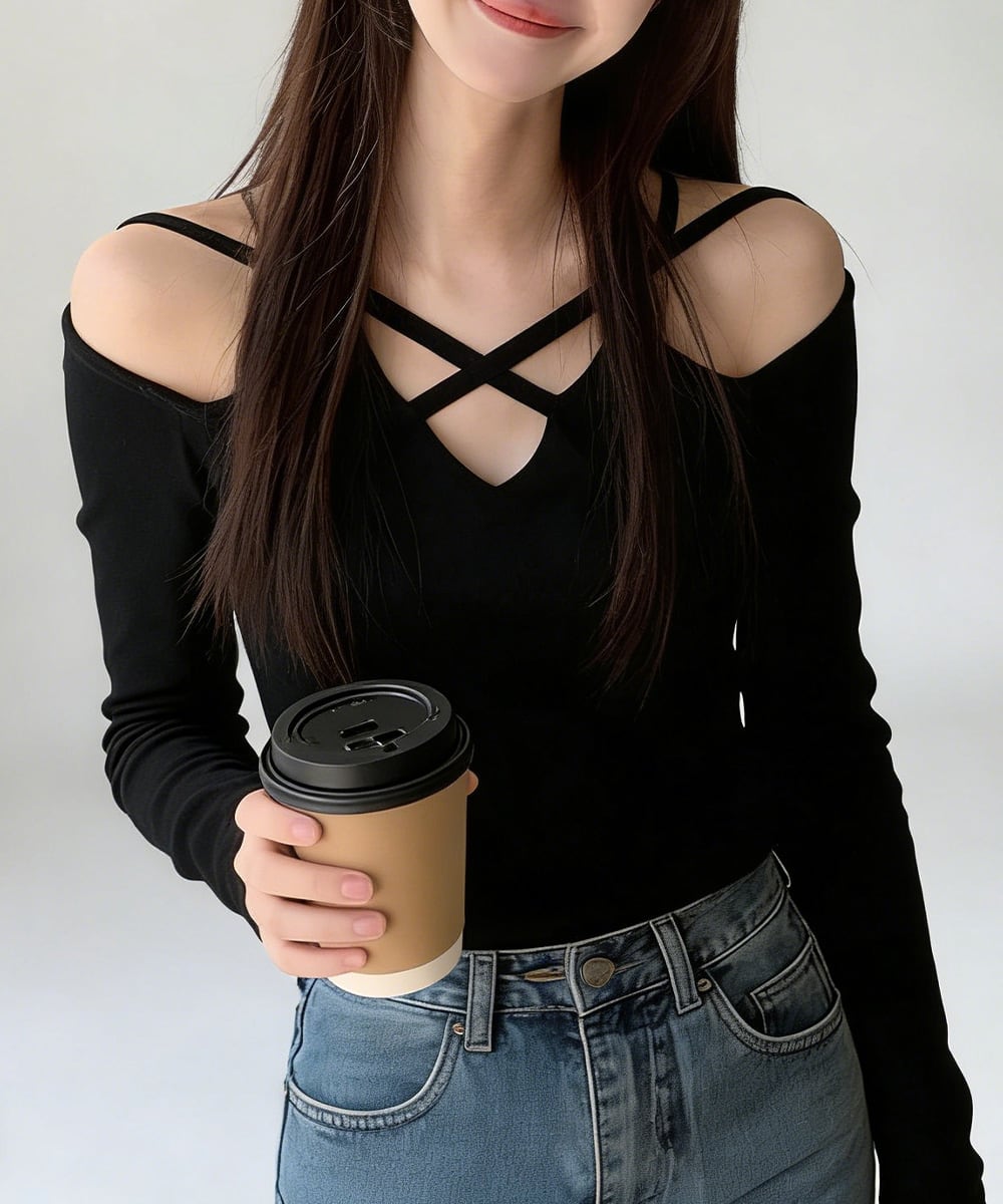 クロスストラップが目を引く、オフショルダーデザインの長袖Tシャツ。