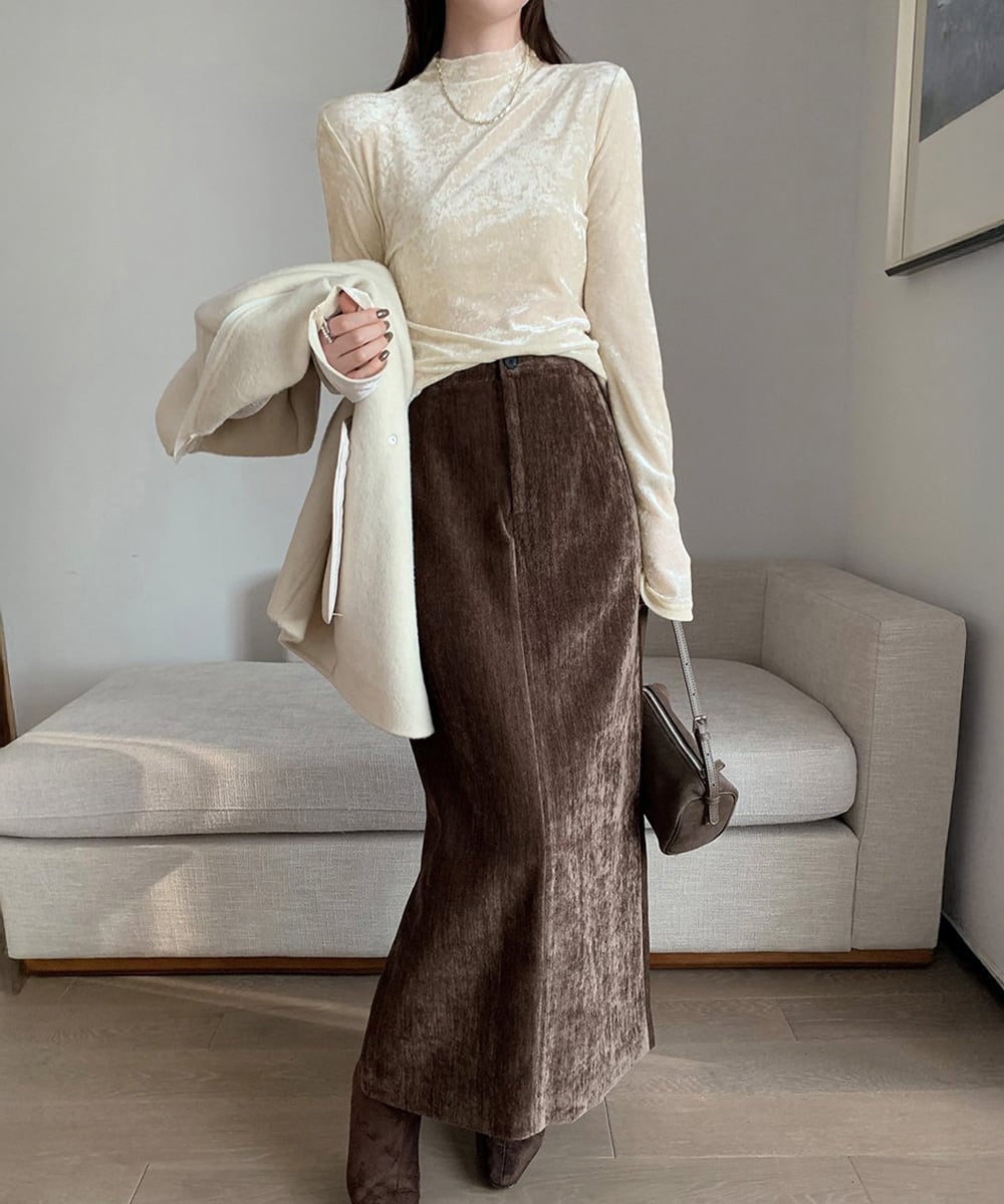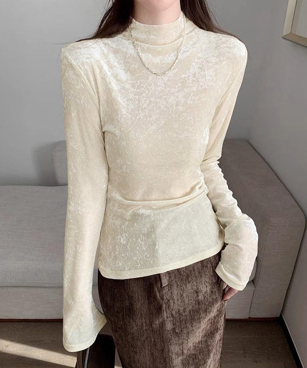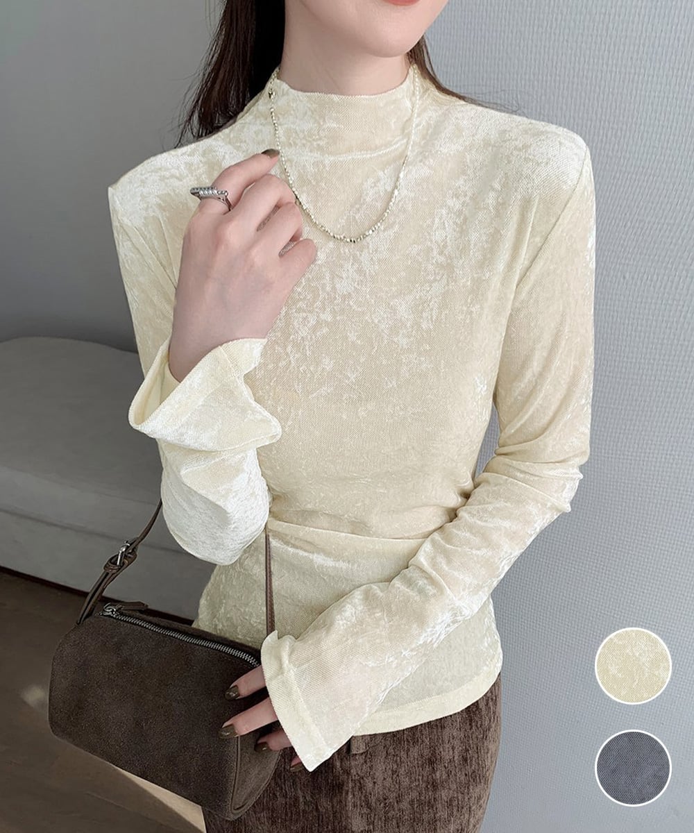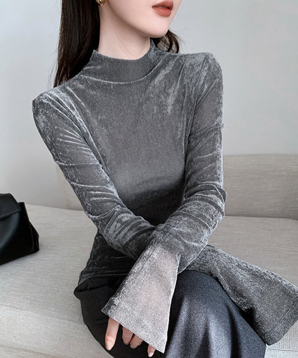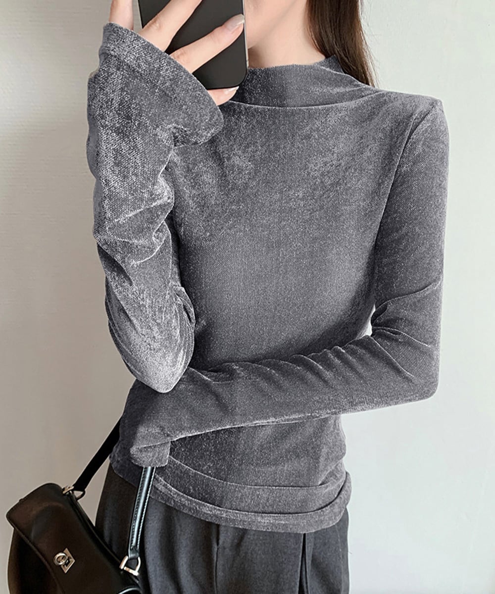 なめらかな質感と上品な光沢が魅力のベロアプチハイネックトップス。