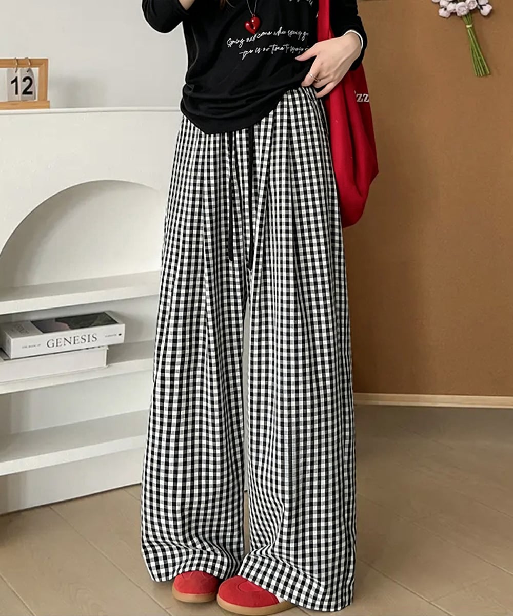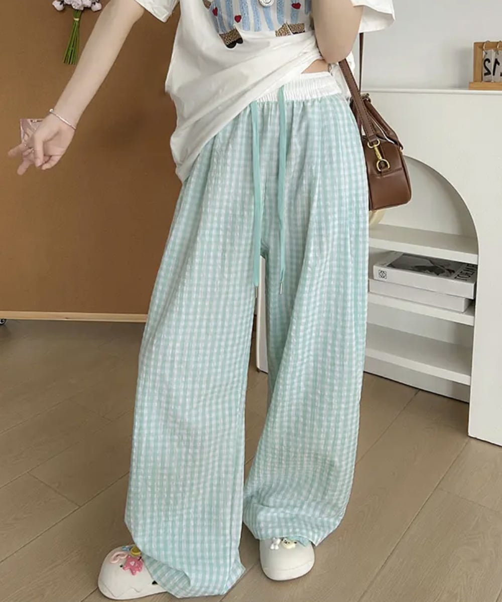 春夏に映える爽やかなギンガムチェック柄のイージーワイドパンツ。