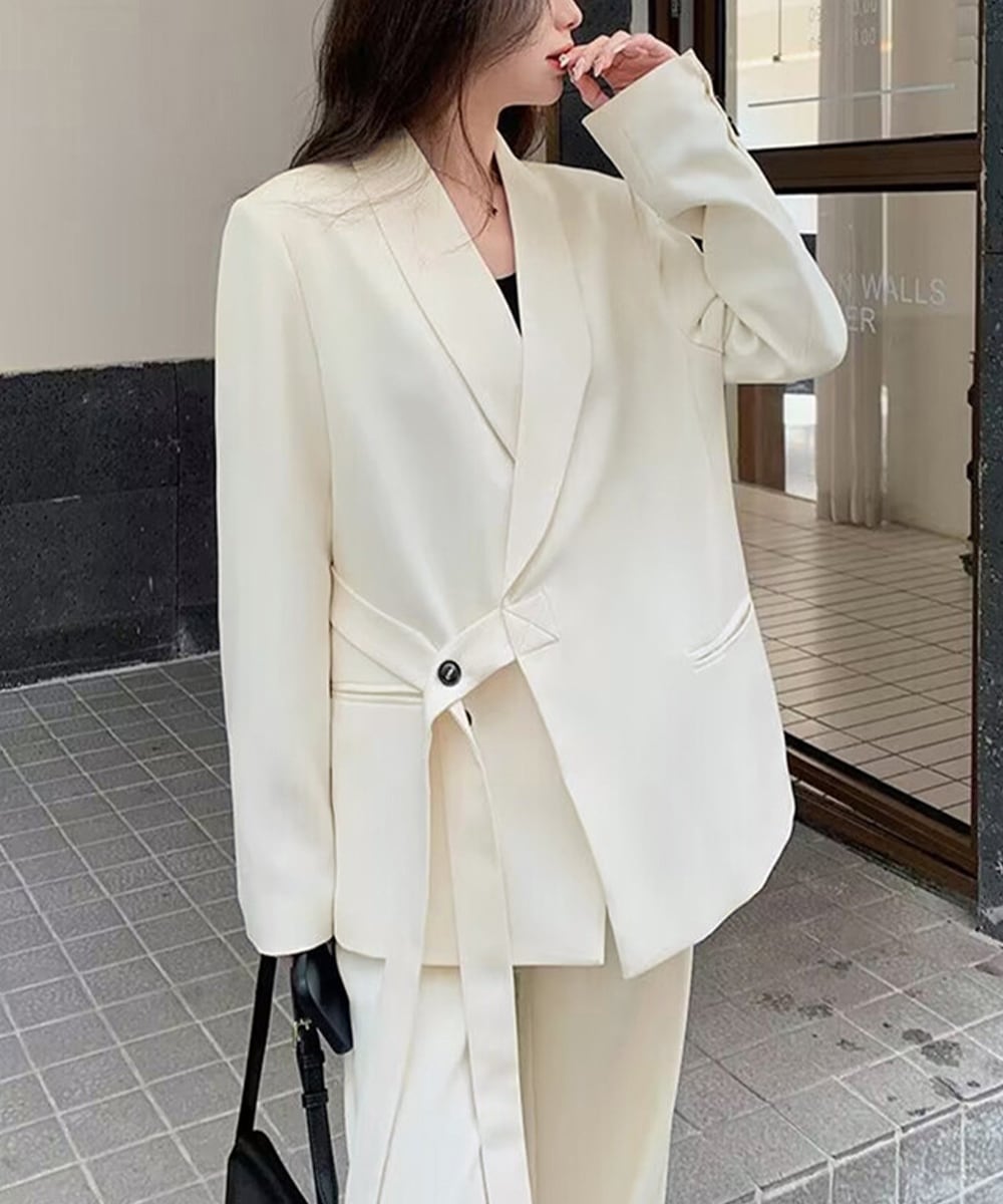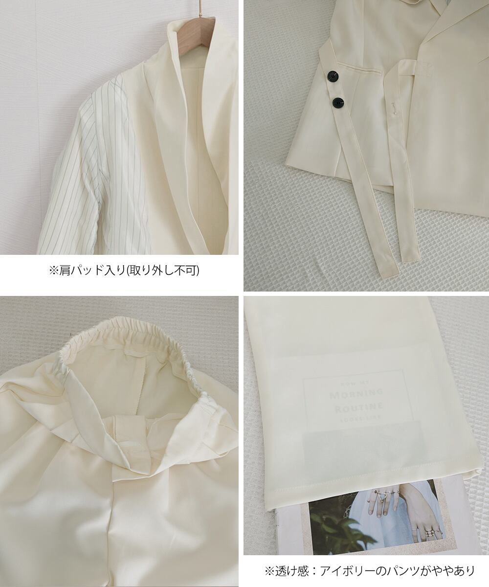 洗練された印象のテーラードジャケットとワイドパンツのセットアップ。