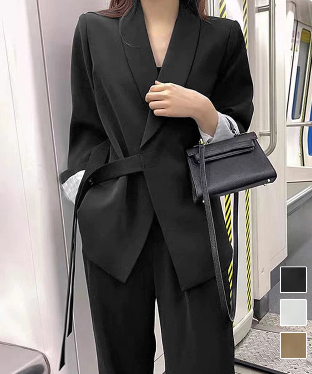 ベルト付きウエストマーク ロングジャケット ゆったり セミワイドパンツ 大人上品セット オフィススーツセット30代40代