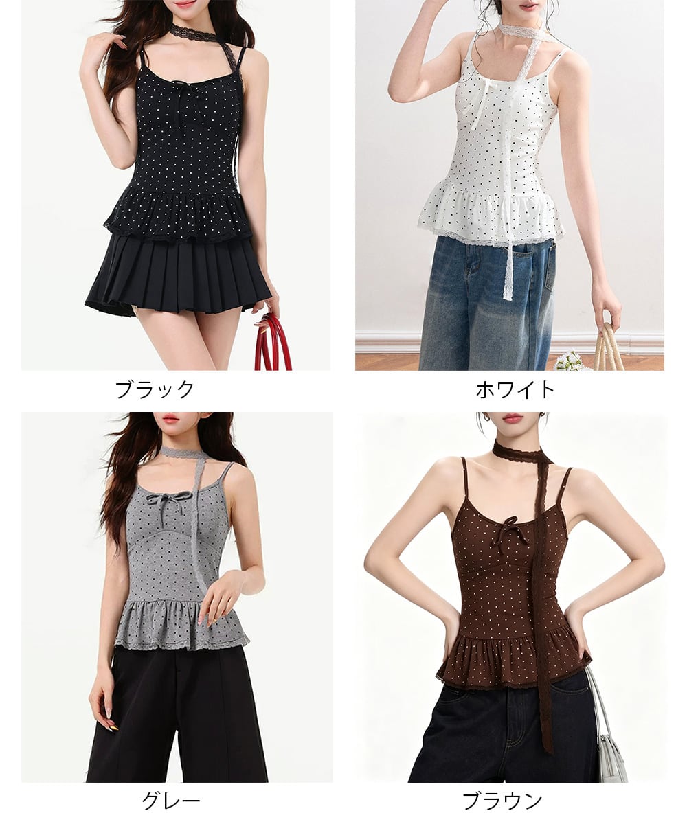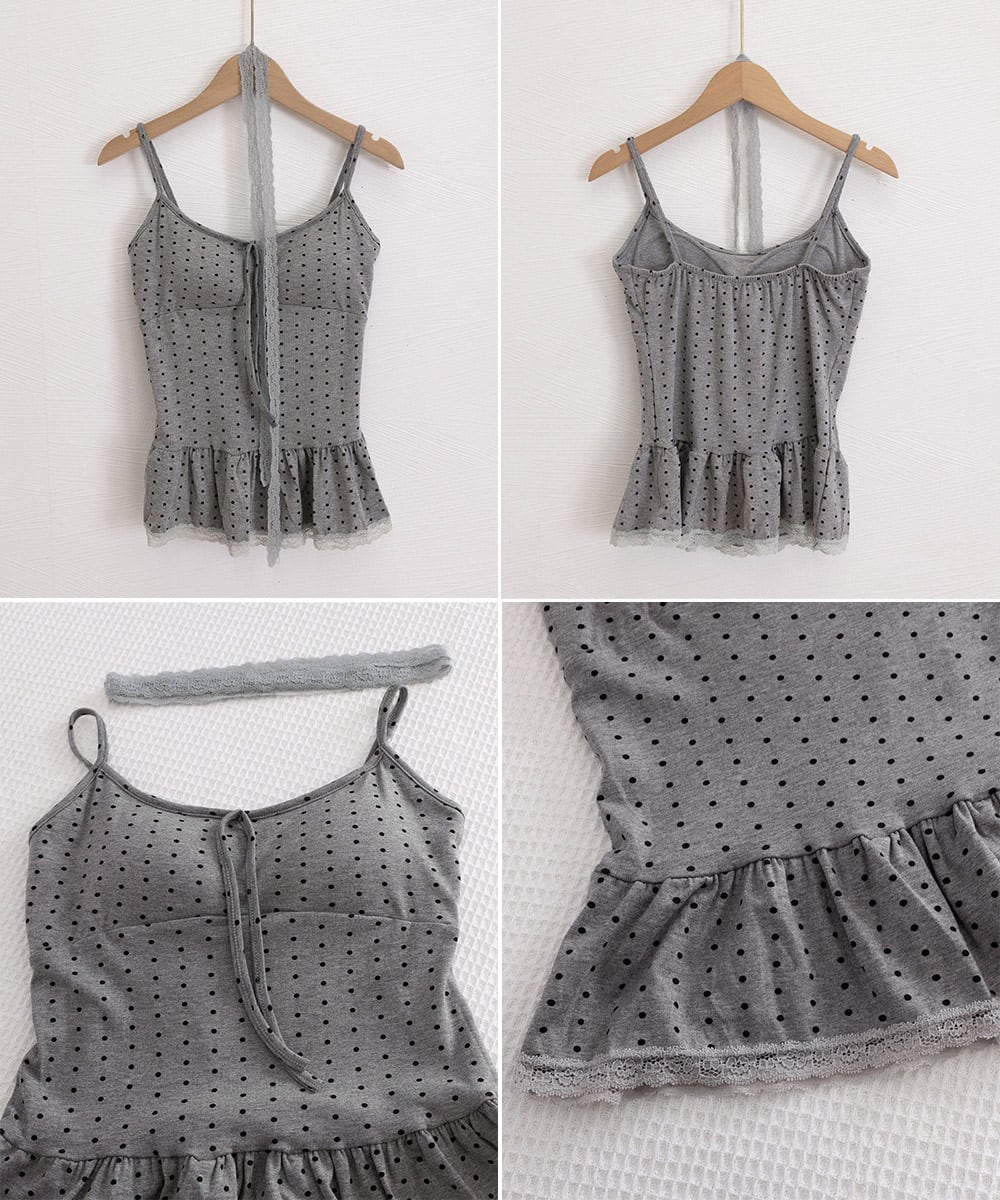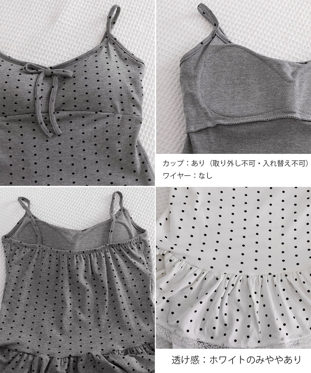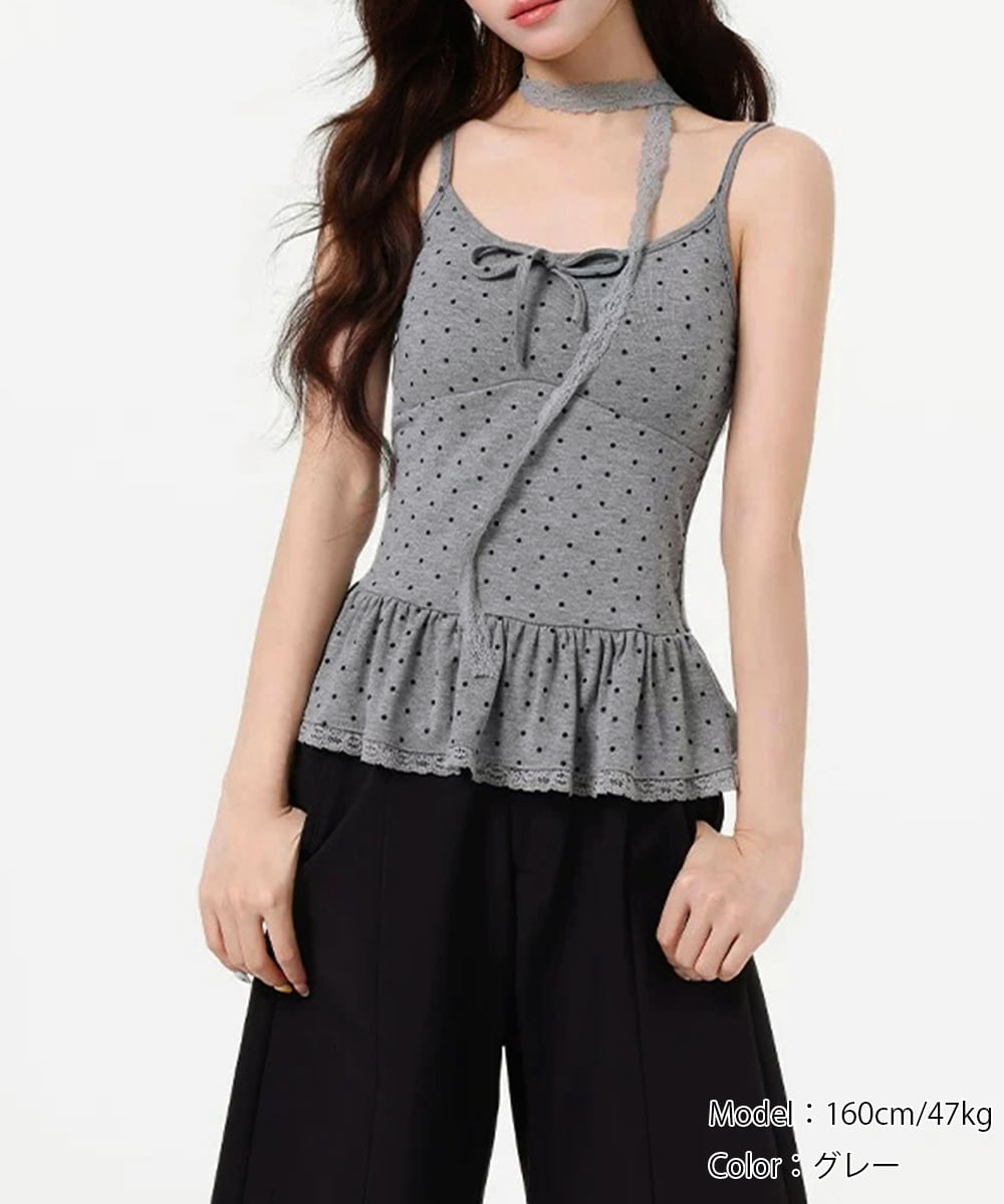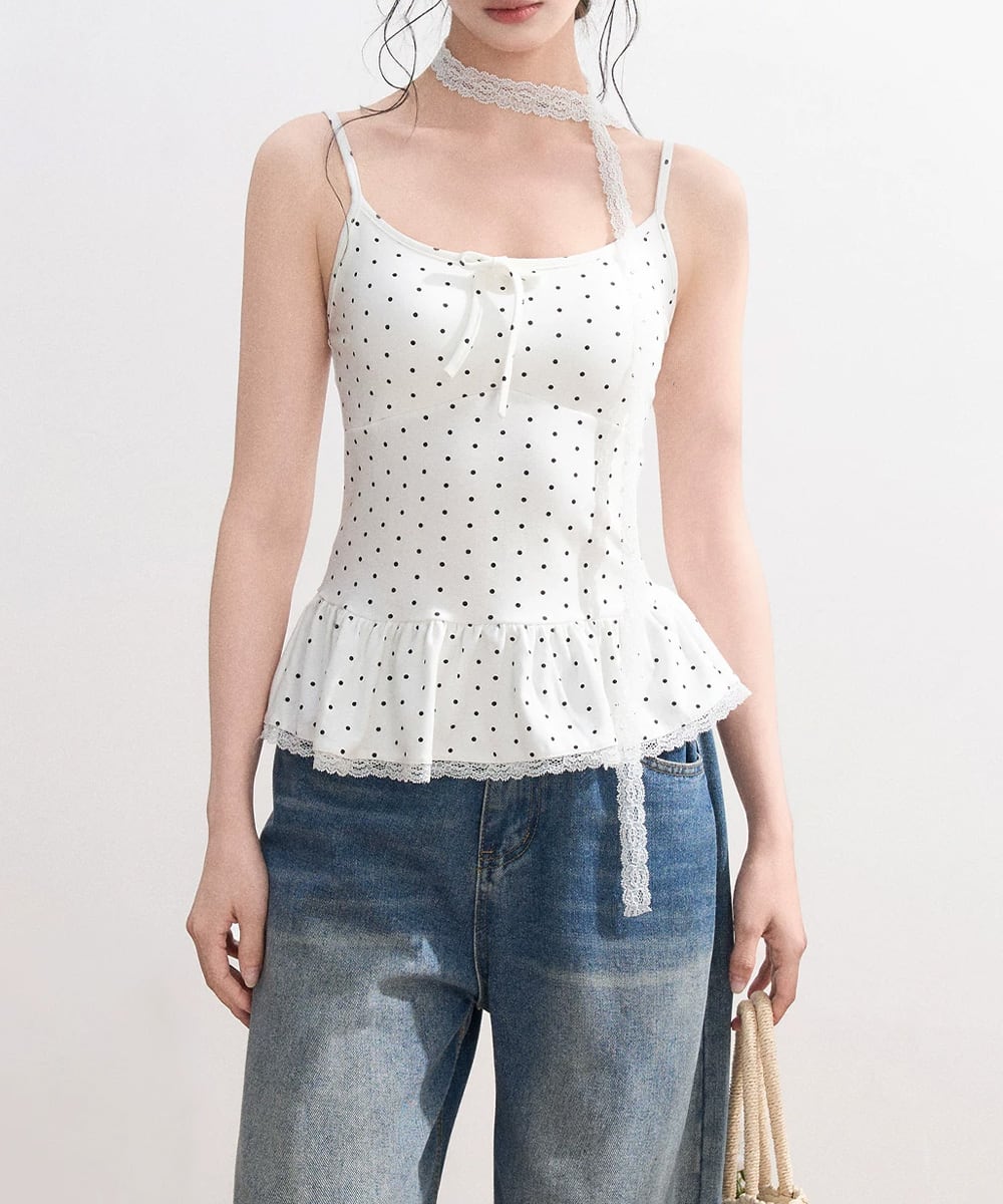 細かな水玉柄にフェミニンなアクセントを添えたキャミソール。