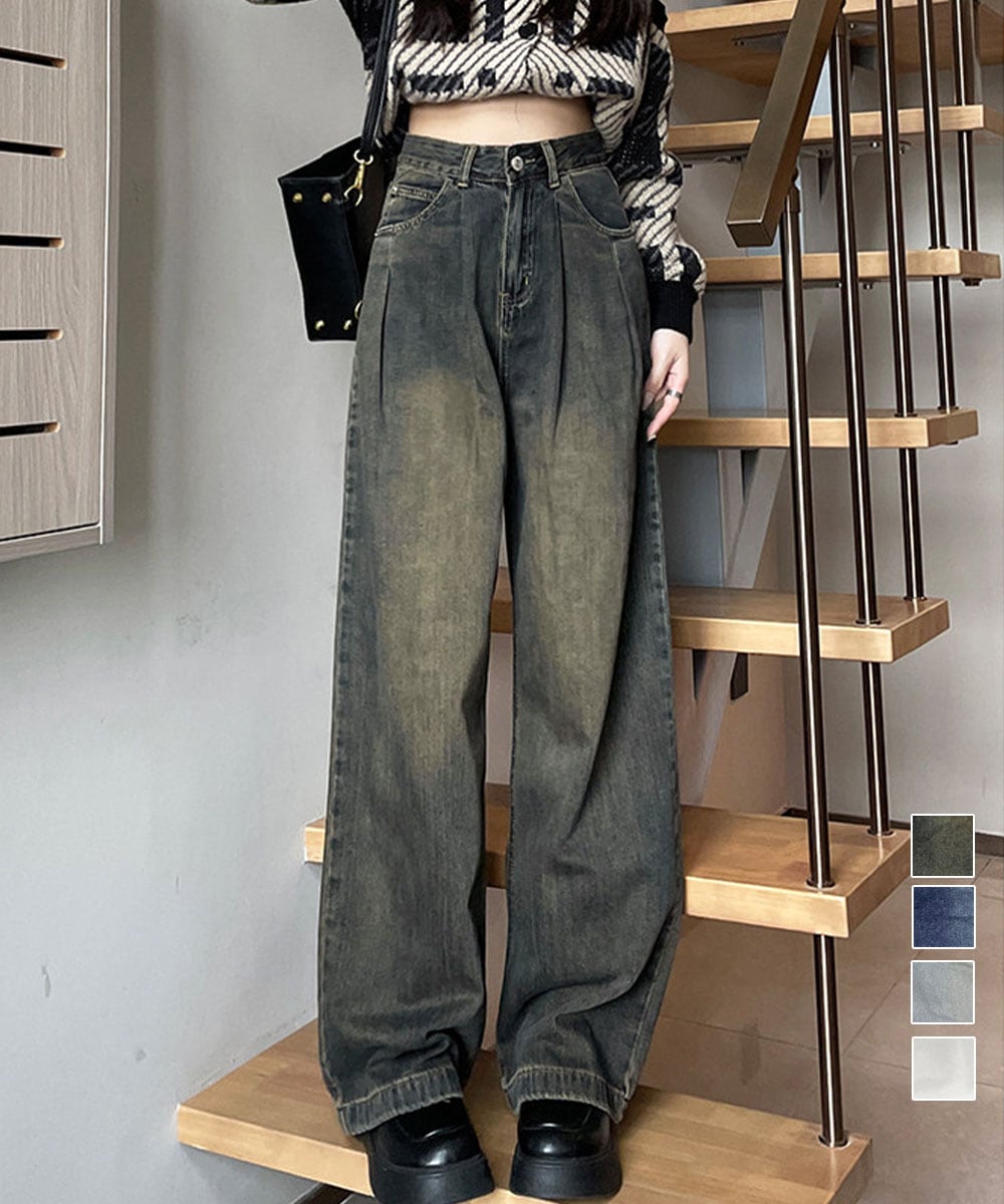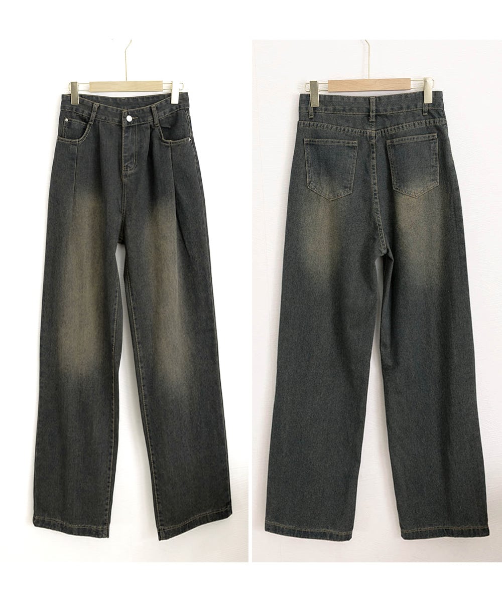 ヴィンテージ加工を施したハイウエストタックワイドデニムパンツ。