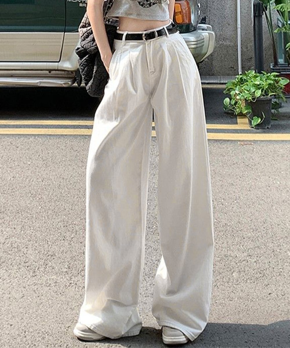 ハイウエスト×ワンタックのゆったりシルエットで体型をカバーしつつ、脚長見えとスタイルアップが狙える。