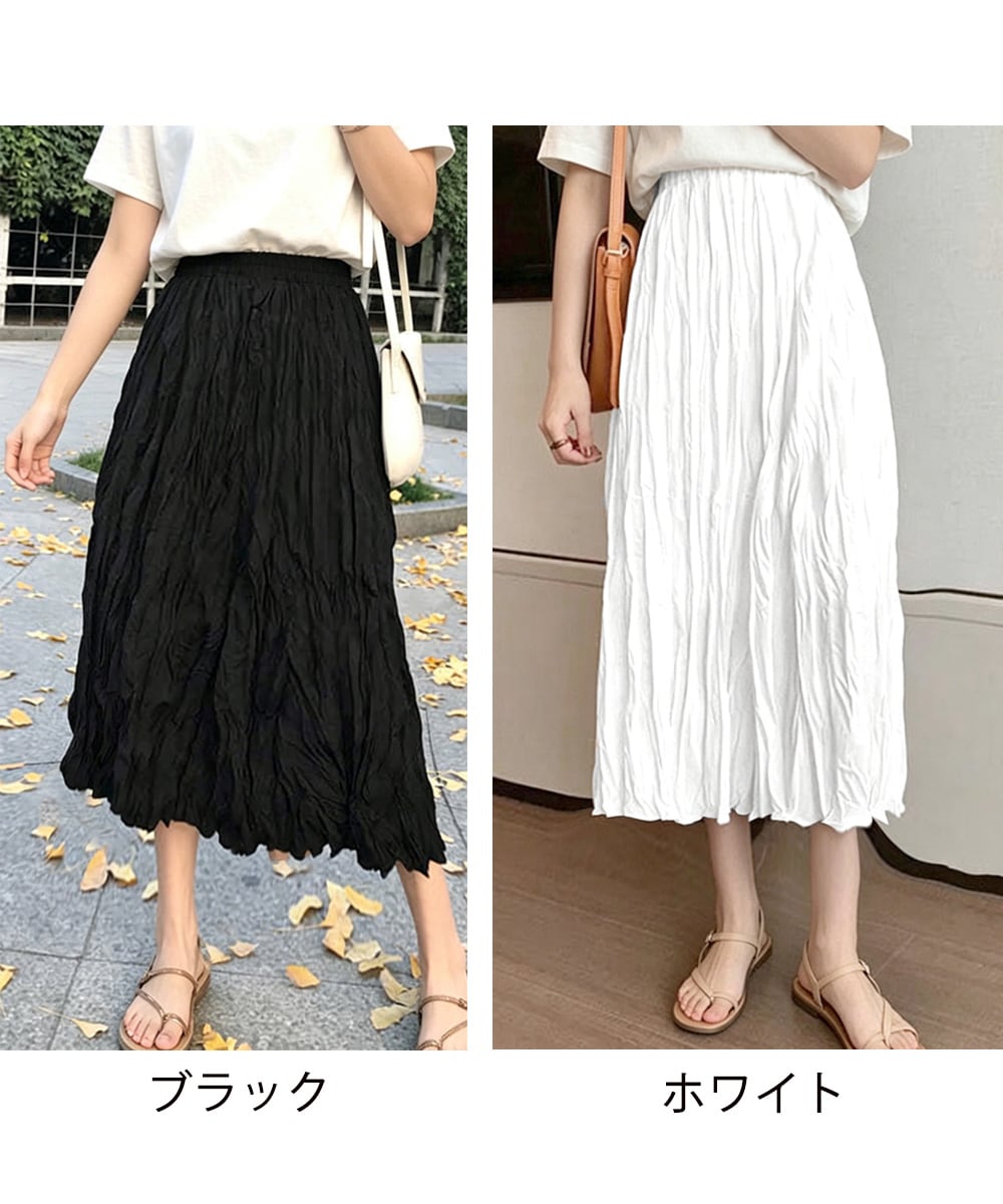 スカート ウエストゴム 裏地付き フレアスカート 大人可愛い 体型カバー 春夏スカート ランダムプリーツ 黒 白 無地