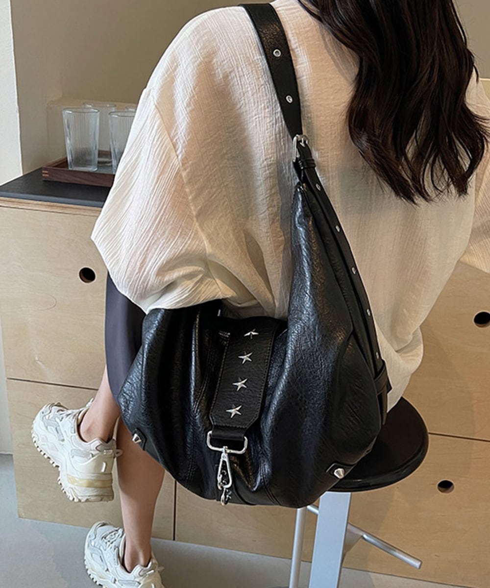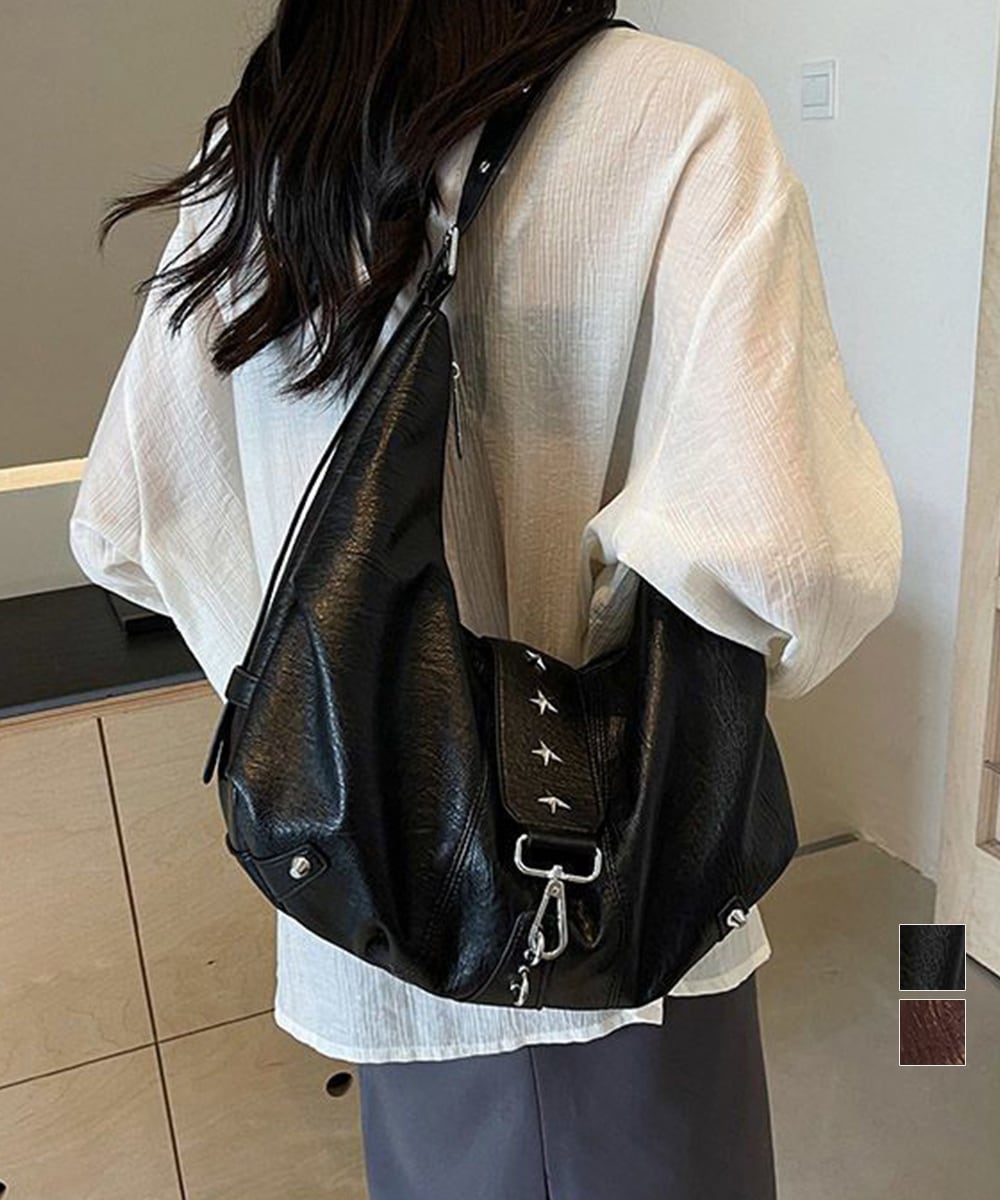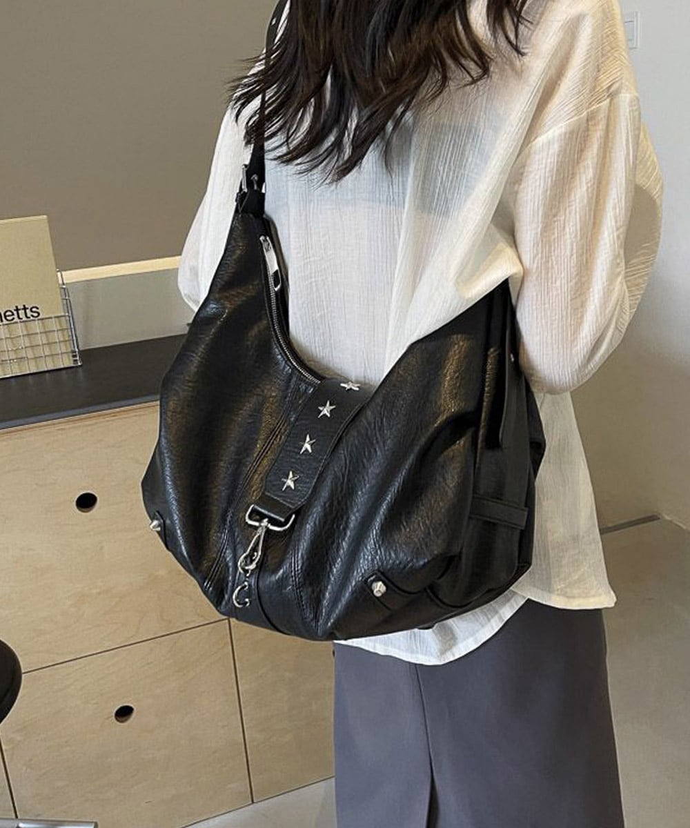 ヴィンテージライクな風合いのレザーに星型スタッズがアクセントを添える、大容量ホーボーバッグ。