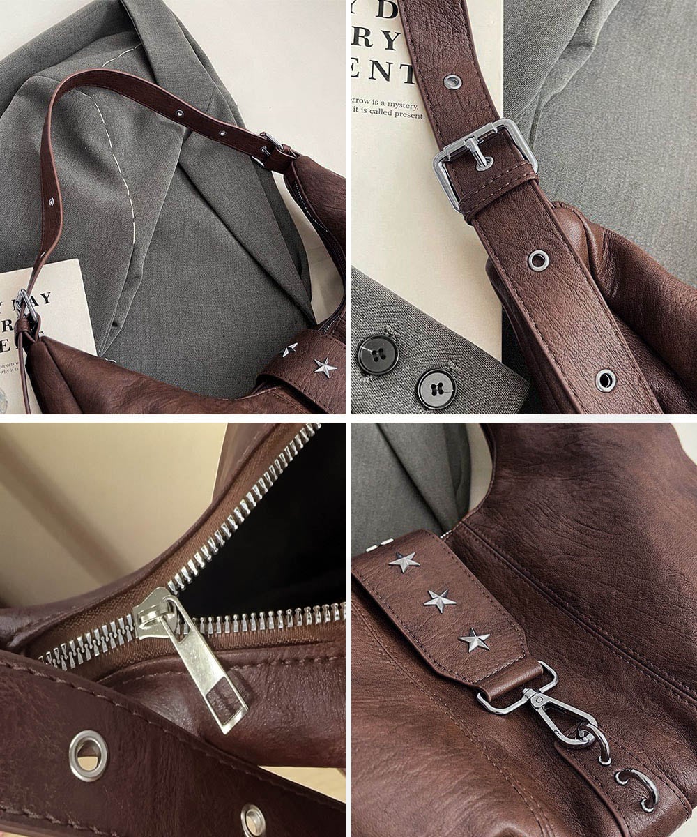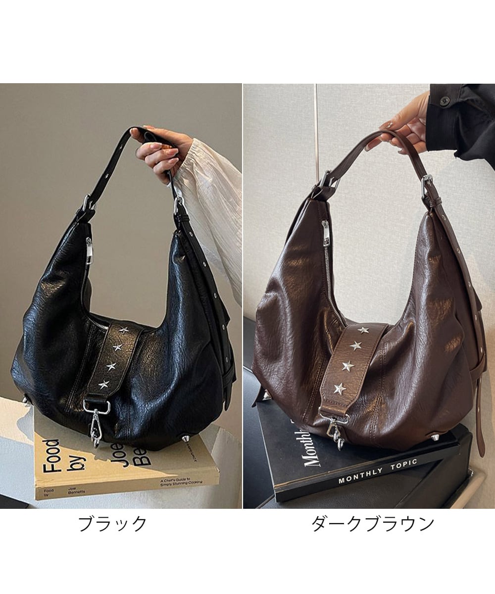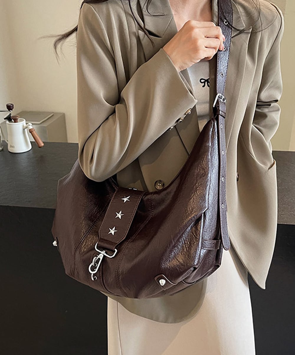 ヴィンテージライクな風合いのレザーに星型スタッズがアクセントを添える、大容量ホーボーバッグ。