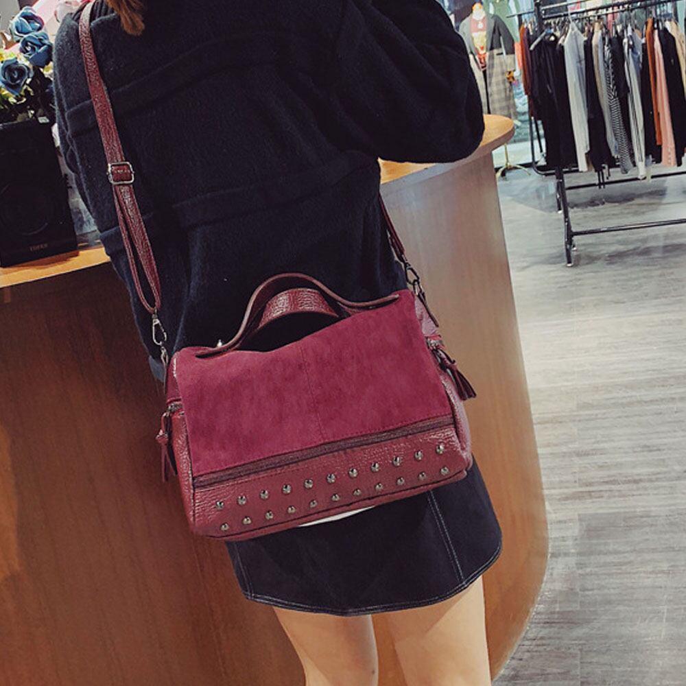 PUレザーとスエードタッチスタッズ装飾コンパクトショルダーバッグ