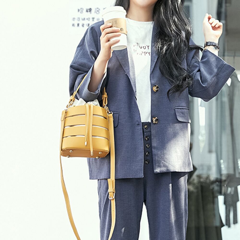 生地はしっかりとした厚みで上質なフェイクレザーで仕上げた透かしのバケツ型ショルダーバッグ