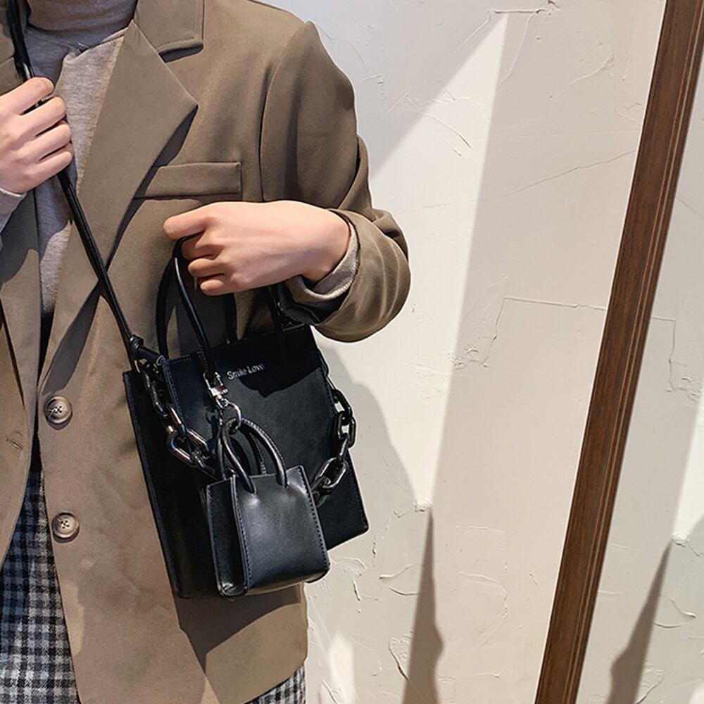 チェーン鎖がデザインのアクセントになり、とてもお洒落な縦型ミニショルダーバッグ