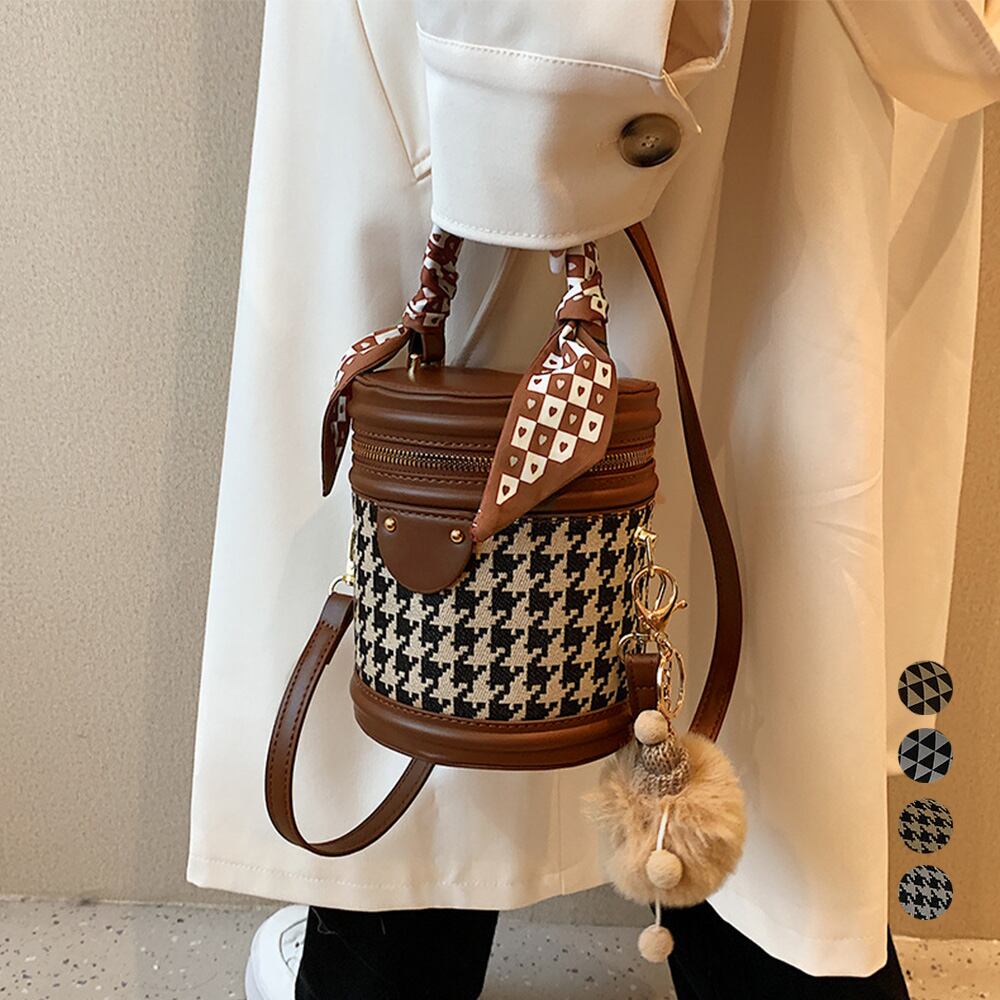 筒型バッグ レトロ 小さめ 2way鞄 ハンドバッグ 手提げかばん 千鳥柄 肩掛けバッグ スカーフ付き キーホルダー付き