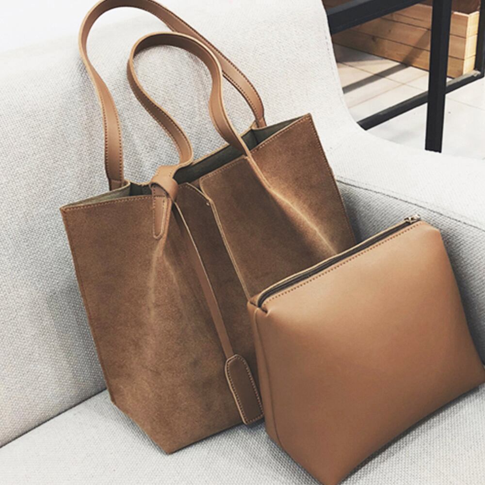 大容量のフェイクレザートートバッグとポーチの2点セット