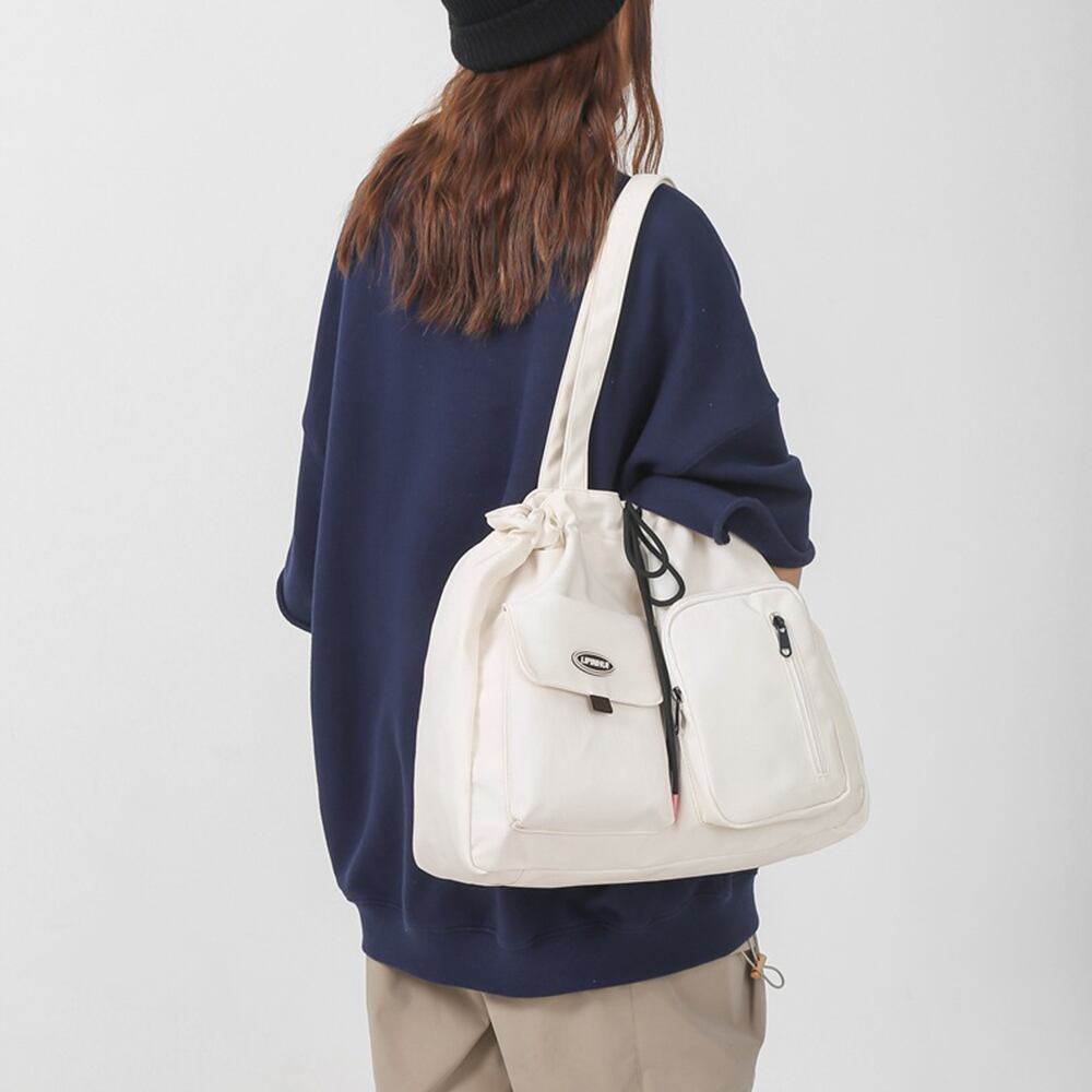 シンプルなトートとしてはもちろん、開口部の紐をぎゅっと絞めればギャザーの入った巾着型としても使えるトートバッグ