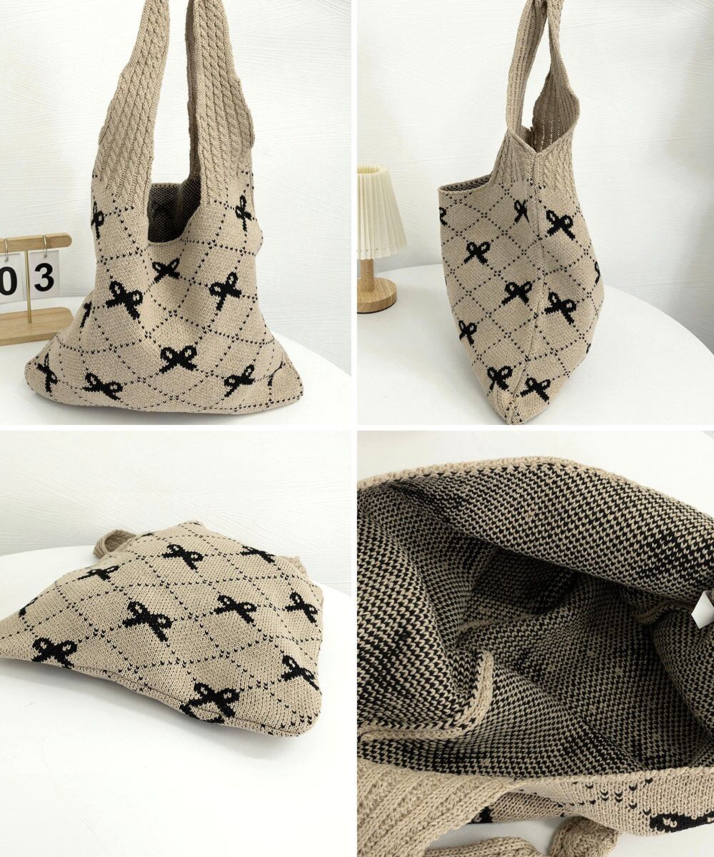 可愛いリボン柄がアクセントになり、コーデにこなれ感をプラスするニットトートバッグ