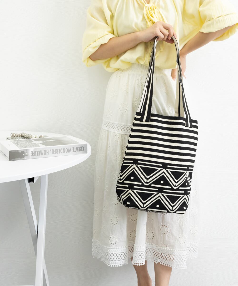 スタイリングに映えるデザインが目を引くニット素材のマルシェトートバッグ