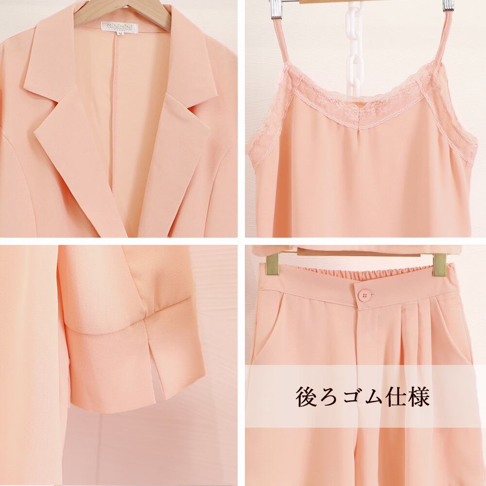 上下3点セット 長袖 ジャケット 春夏 Vネック レース キャミソール ウエストゴム ショートパンツ OL通勤 着やせ