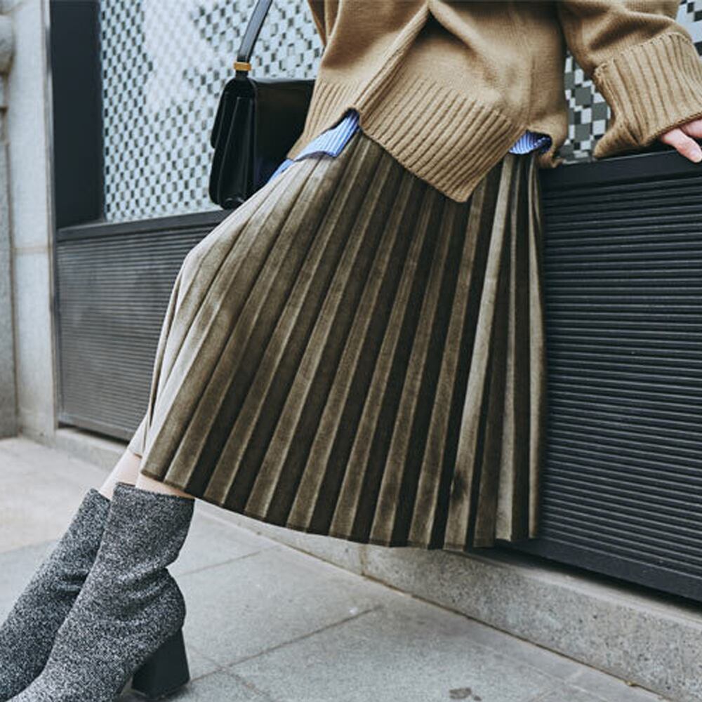 柔らかいベロア仕上げ、揺れ感があるウエストゴムプリーツスカート