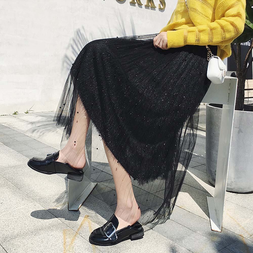 パールの装飾が上品で女性らしいトレンドのチュールスカート