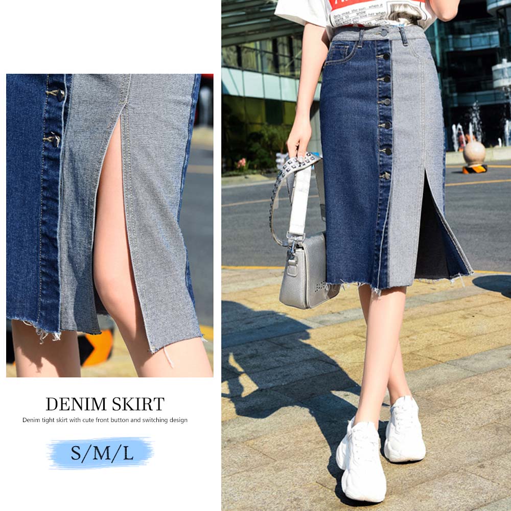 フロントボタンと切り替えしのデザインが可愛いデニムタイトスカート