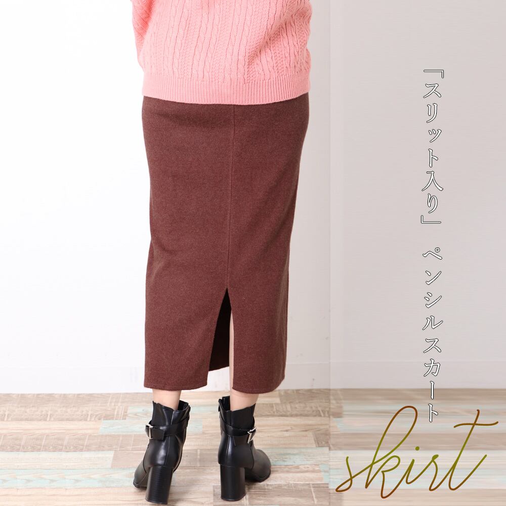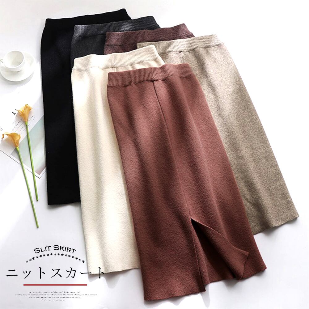 ニットスカート レディース 無地 ウエストゴム タイトスカート スリット入り