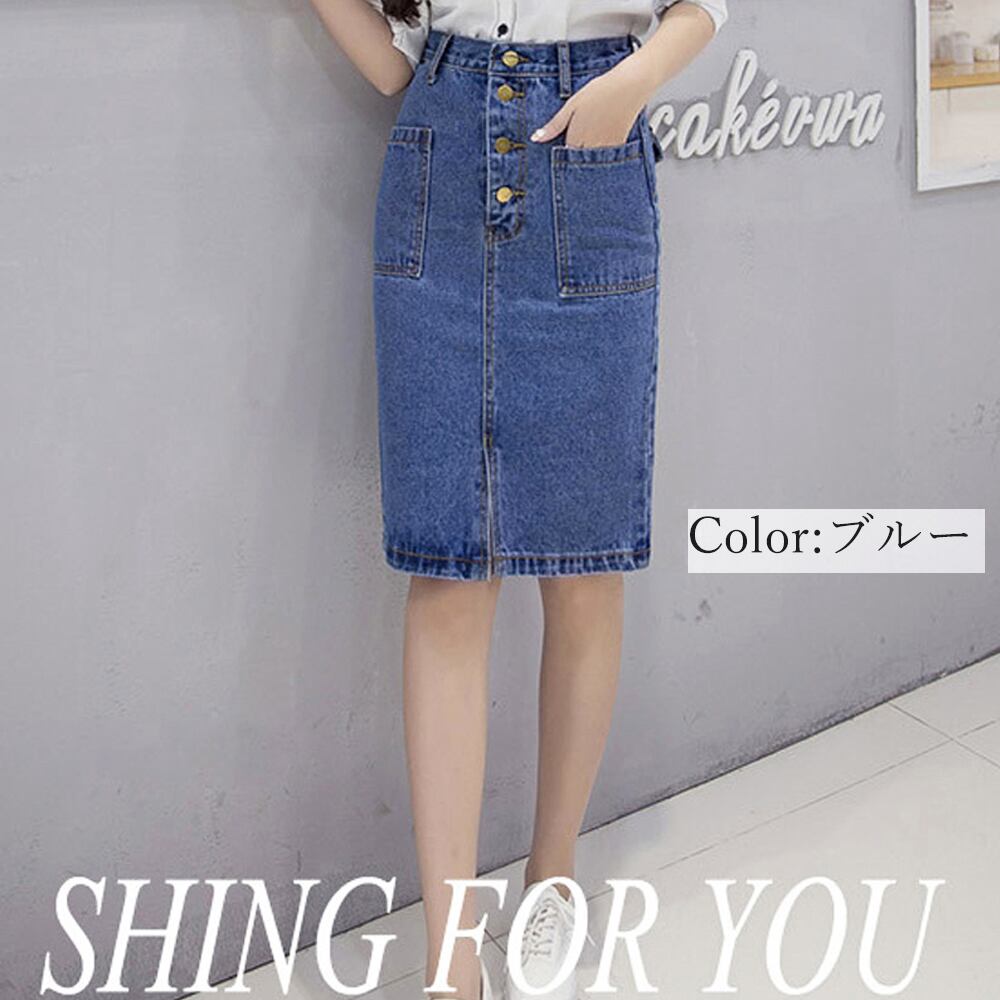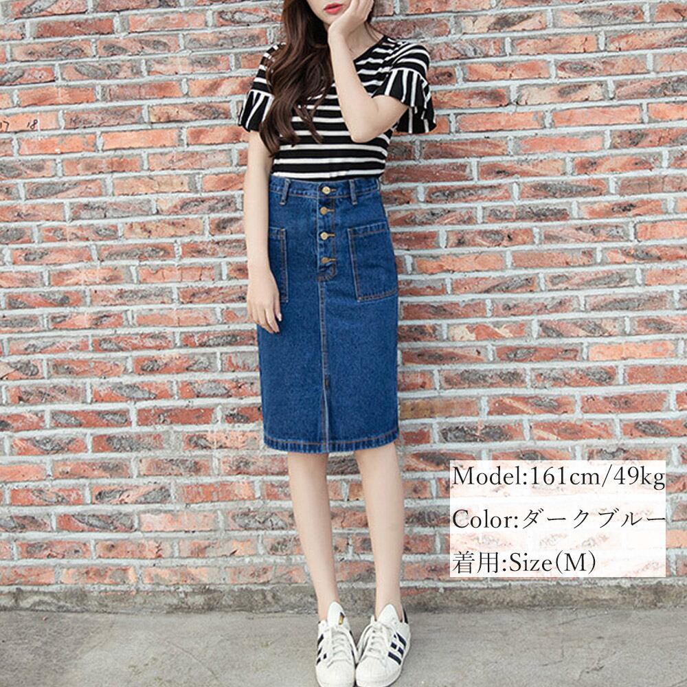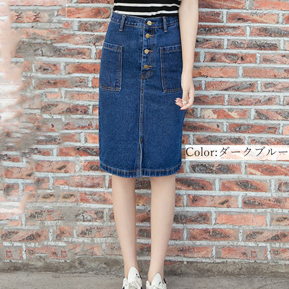 デニムスカート スリット 膝丈 タイトスカート フロントボタン 細見え