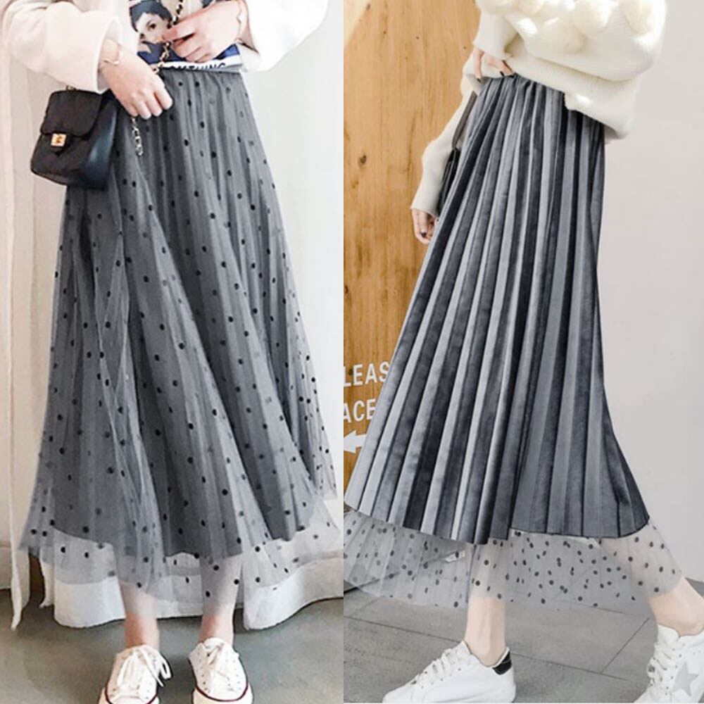 艶めくベロアプリーツ生地にチュールを重ねた異素材ロング丈リバーシブルスカート