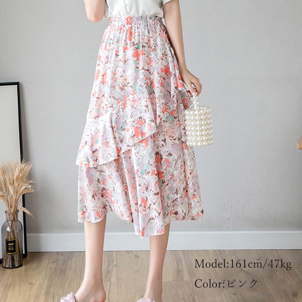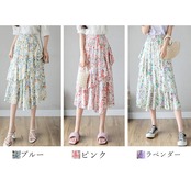 フラワー柄がコーデのアクセント、ミモレ丈で幅広い身長の方に