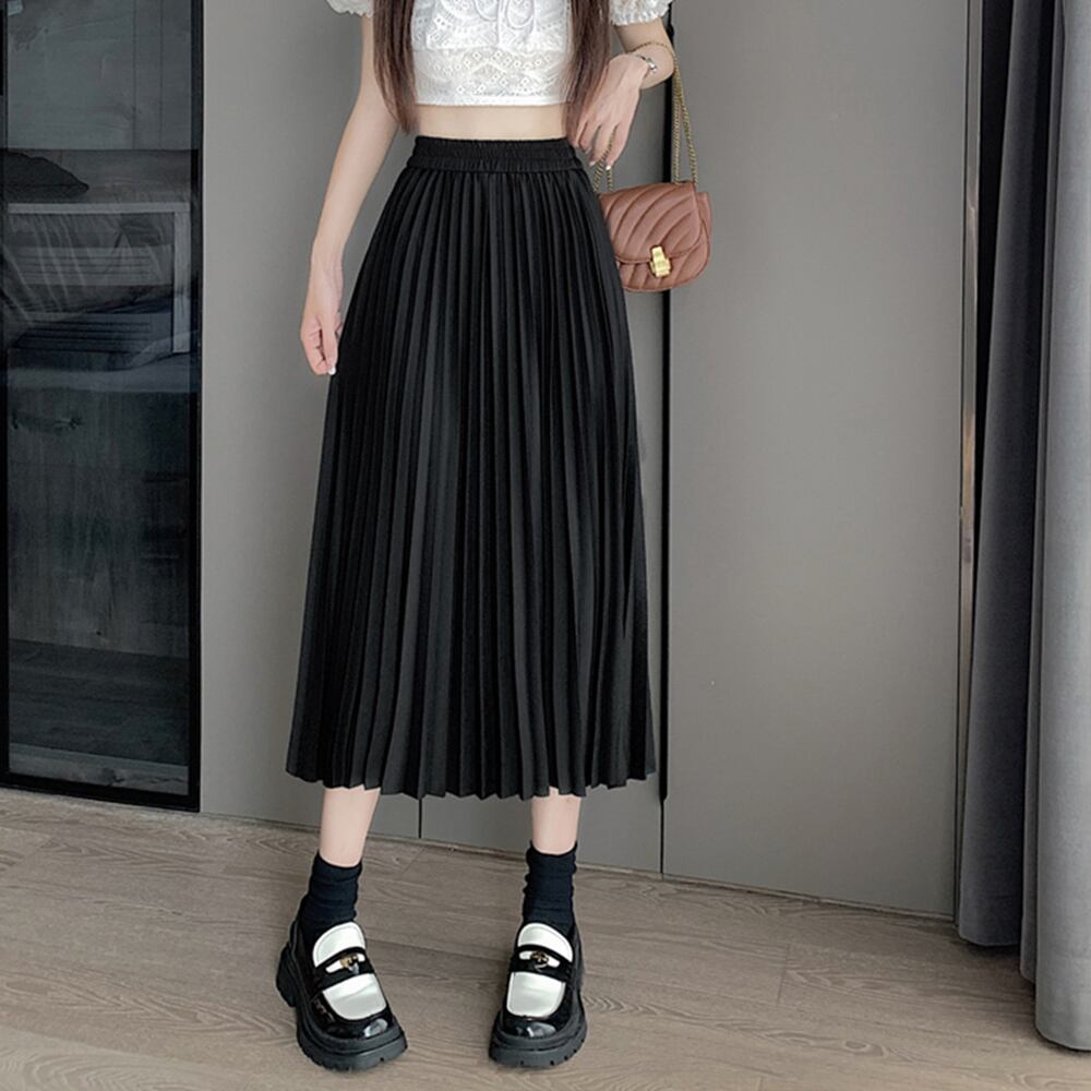 プリーツスカート黒 体型カバーボトムス 春夏ロングスカート