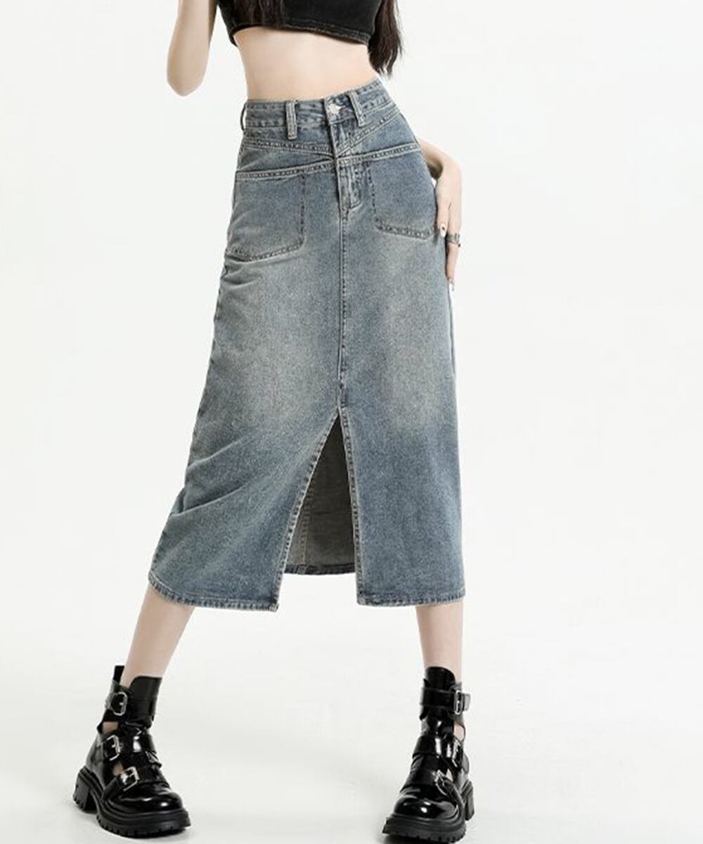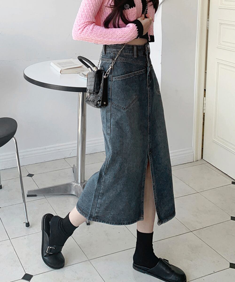 すっきりとした縦シルエットがスタイルアップをかなえるデニムロングスカート