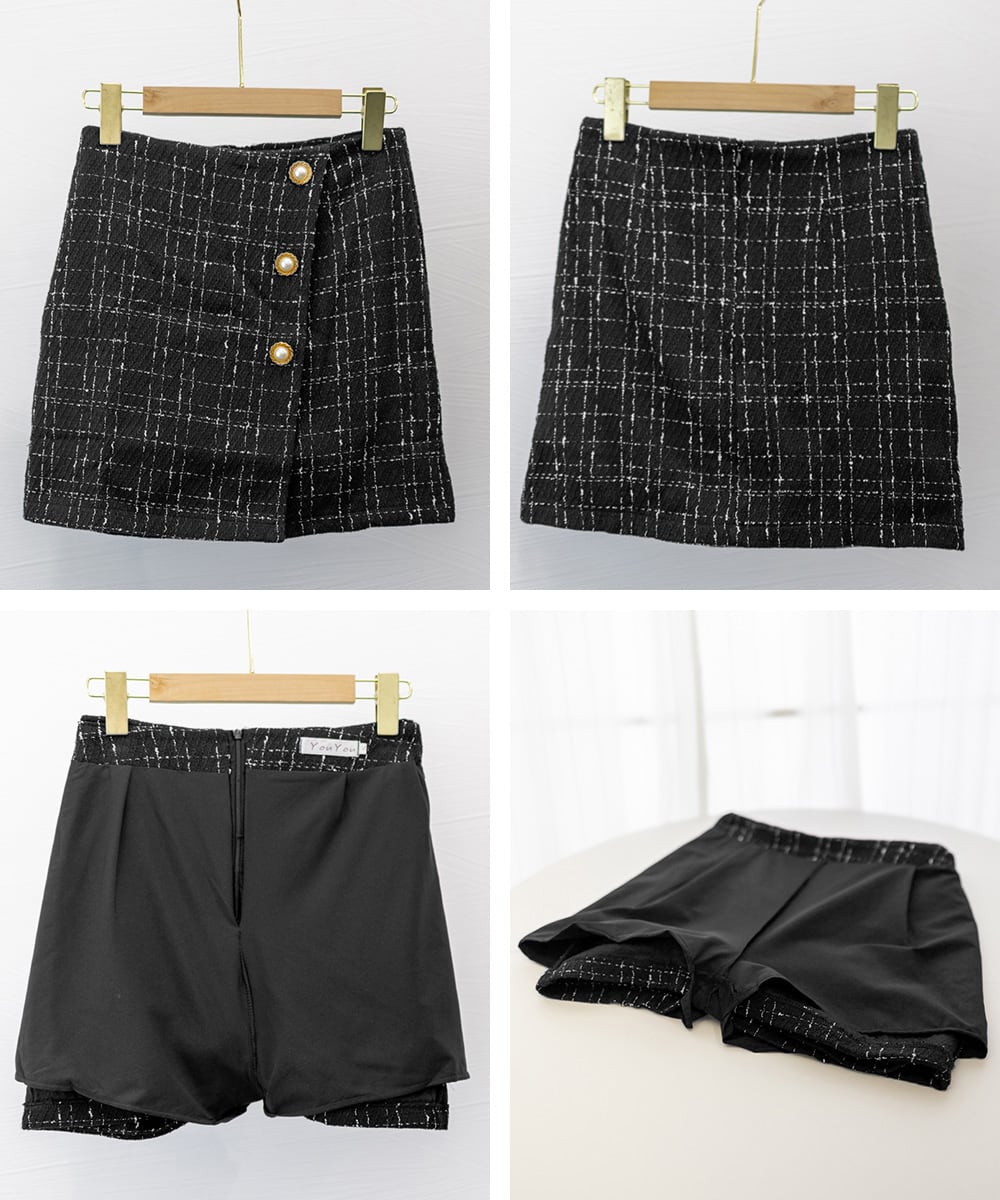 ツイード風素材で上品ムードを作り上げるミニ丈ラップ巻きスカート