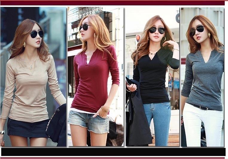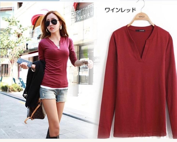 秋新作レディースtシャツ長袖Vネック着痩せ細見効果カットソー 無地