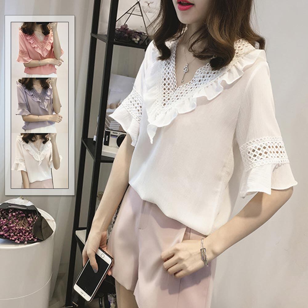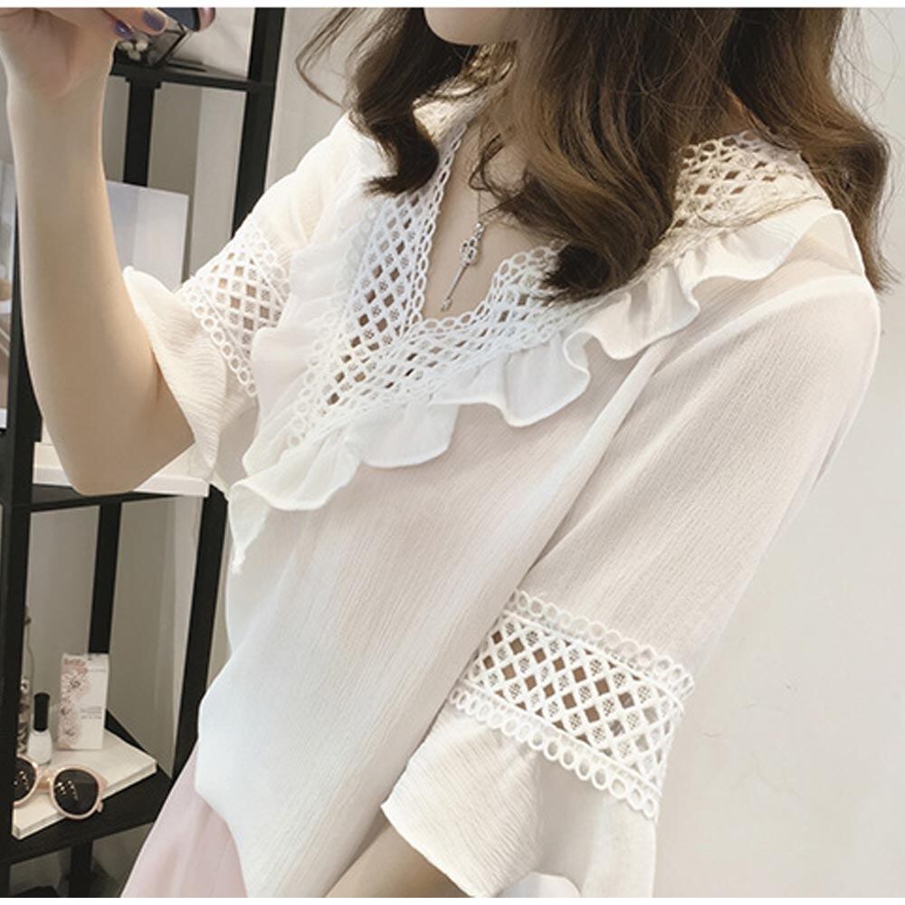 シフォン トップス レディース 半袖 カットソー 白 春夏 Vネック フリル