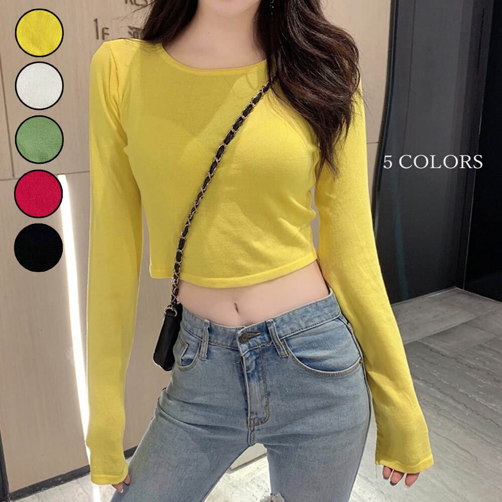 サマーニット トップス 長袖 へそ出し トップス レディース 夏 無地