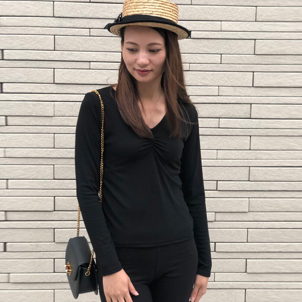 トップス レデイース Vネック カットソー シンプル 胸ギャザー トップス