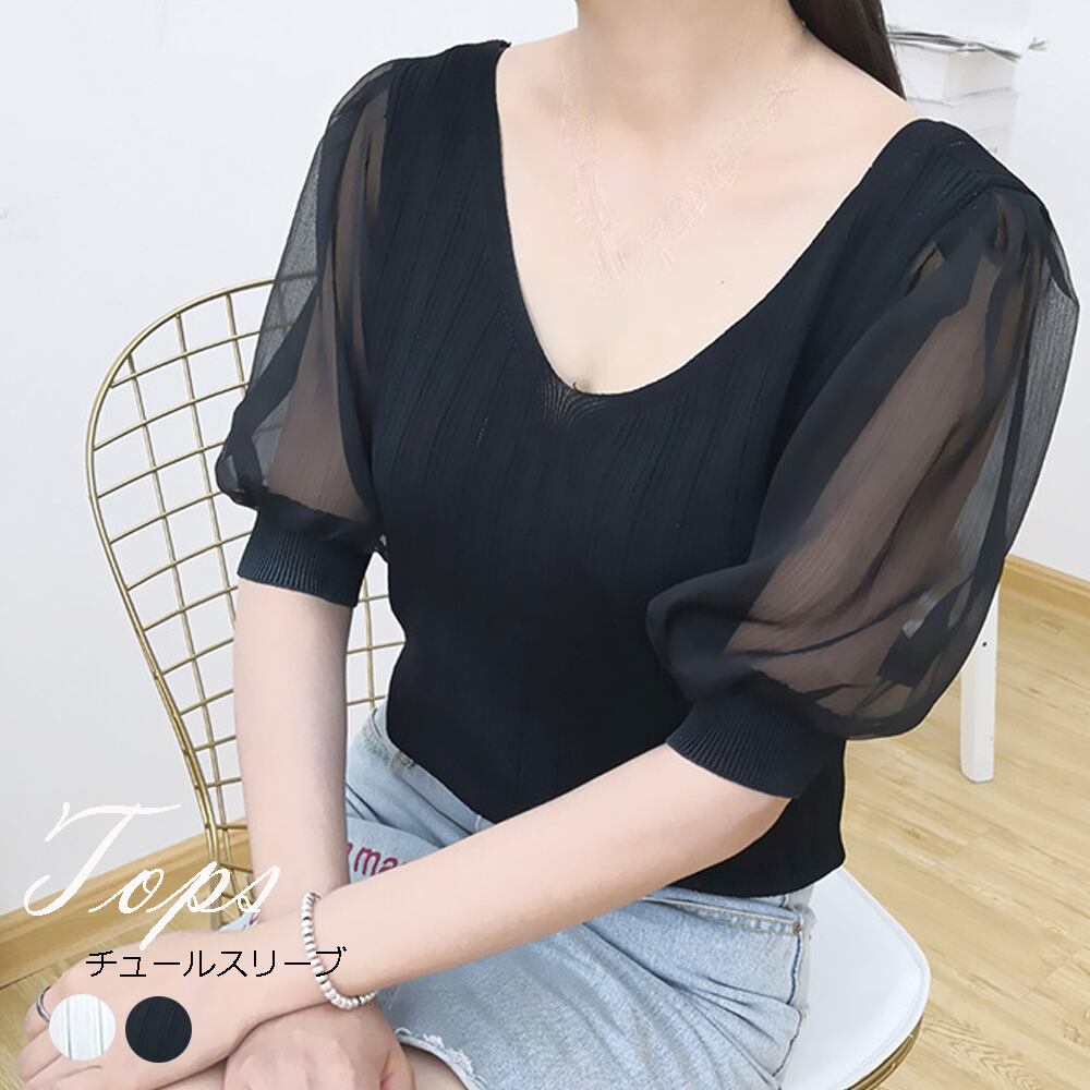 チュールスリーブ レデイース Vネック トップス 半袖 透け感 カットソー
