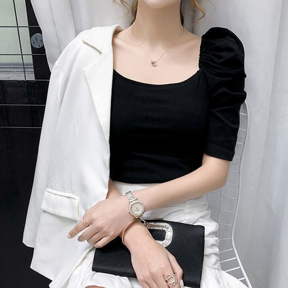スクエアネック トップス レディース パフスリーブ 無地 カットソー 五分袖
