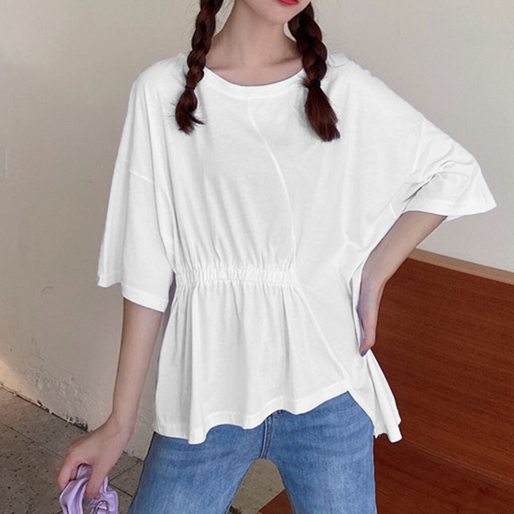 トップス ゆったり アシンメトリー カットソー サイドギャザー クールネック Tシャツ 着やせ トップス 無地 Tシャツ 半袖 カットソー