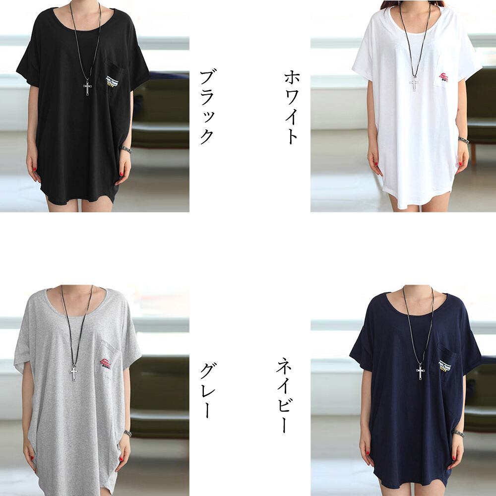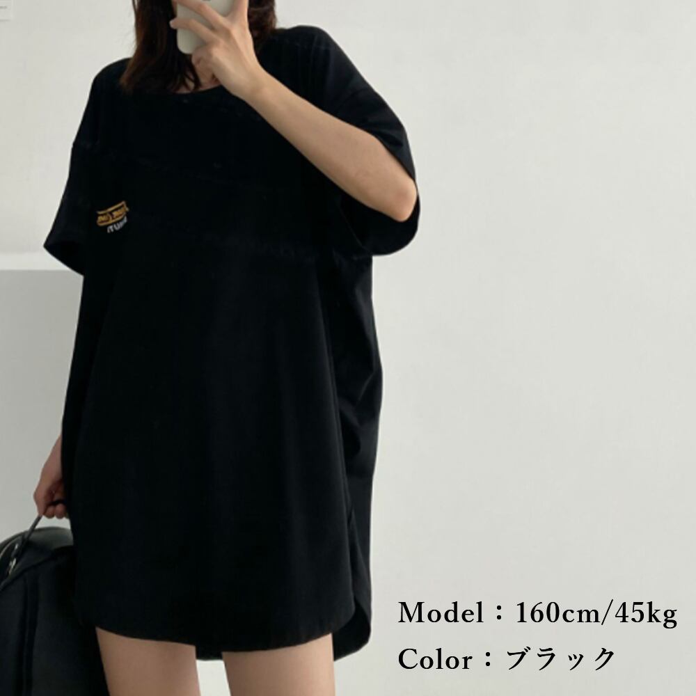 ゆったり ラウンドネック ロゴTシャツ レディース 無地カットソー プルオーバー 体型カバー 着やせチュニックワンピ韓国
