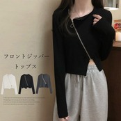レディース フロントファスナー付き カットソー へそ出し 細身 セクシー ショート丈Tシャツ 着やせ