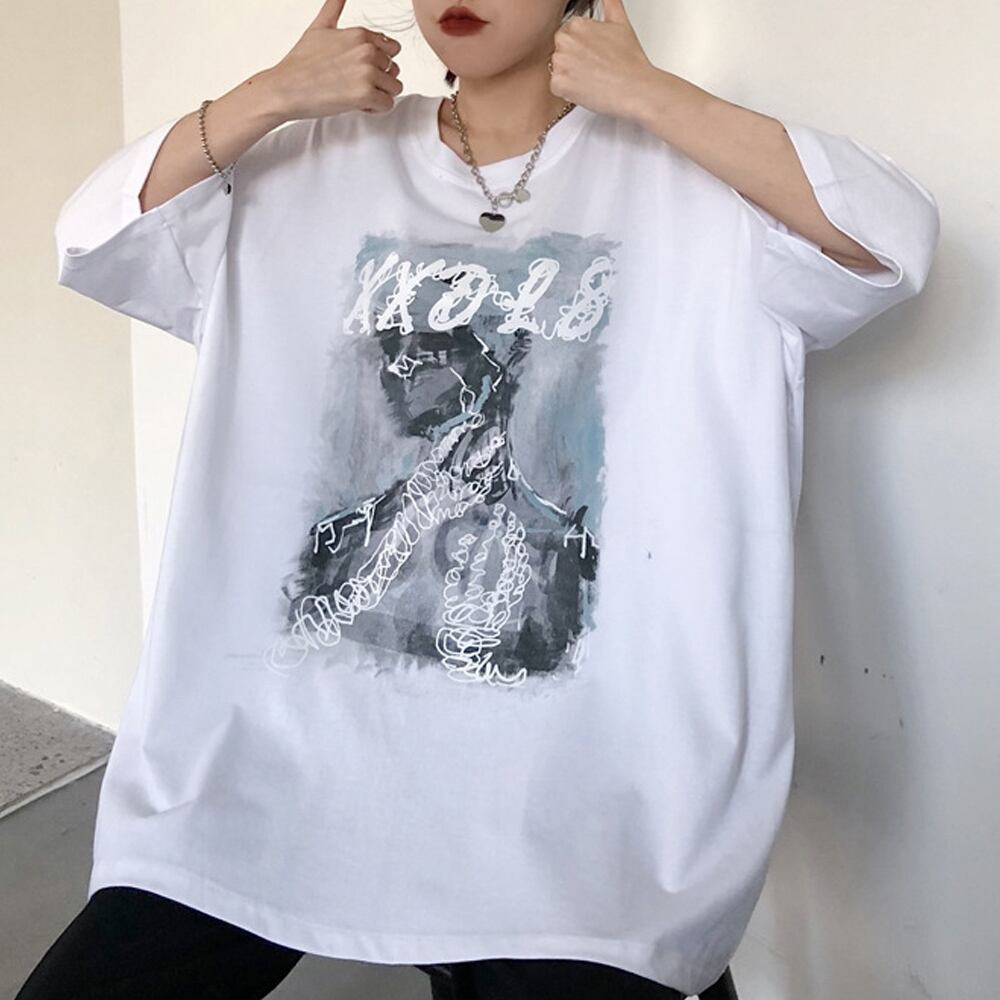 韓国ファッション プリントtシャツ イラスト 柄物 ロング丈 カットソー チュニック おしゃれ Tシャツ トップス 夏秋