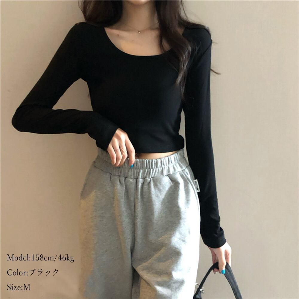 ショート丈 無地トップス カットソー シンプル 長袖トップス 着やせ インナーTシャツ セクシー