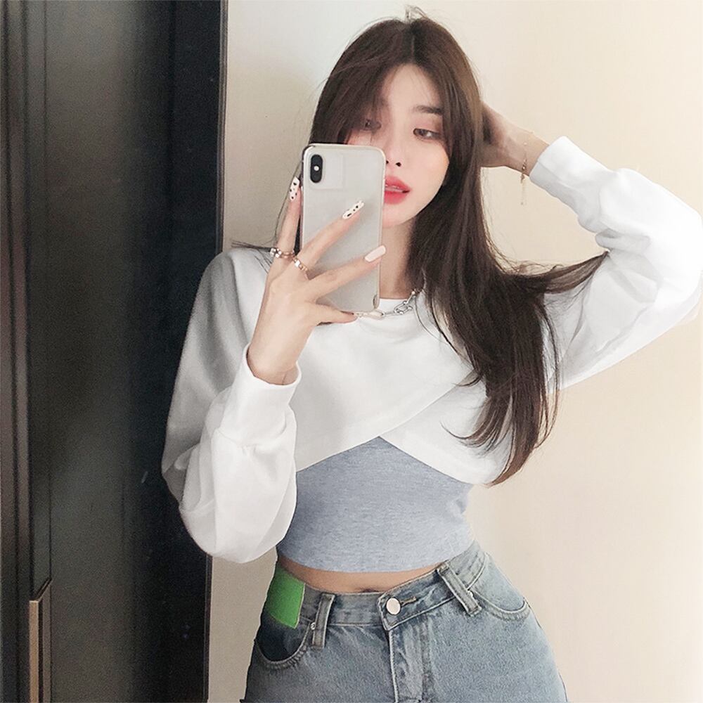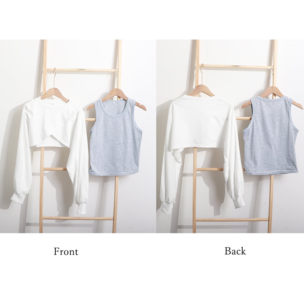 長袖クロップド丈Tシャツとタンクトップの韓国風セットアイテムです